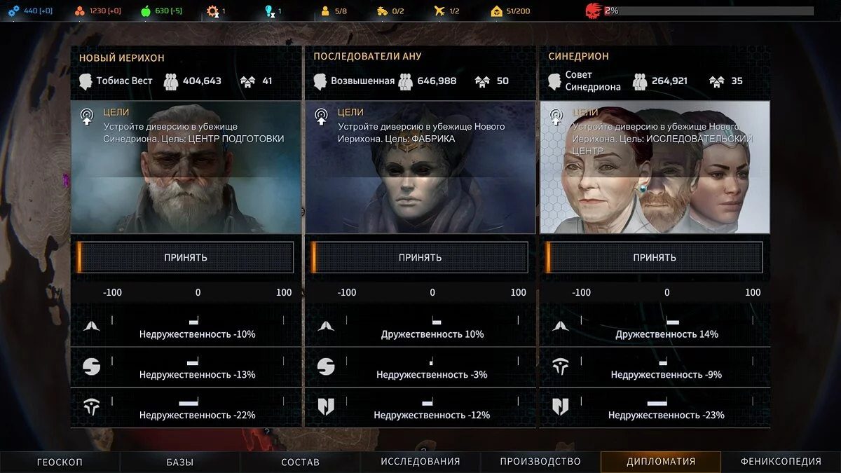 Когда вы только начнёте исследовать различные точки интереса в начале кампании, вы столкнётесь с убежищами, контролируемыми тремя фракциями. Как только встретите одну из группировок, вам откроется возможность начать исследовательский проект с целью узнать больше о той или иной стороне. Вы также сможете просматривать эти фракции и их глобальный статус (как их отношение друг к другу, так и лично к вам) во вкладке «Дипломатия» (Diplomacy).