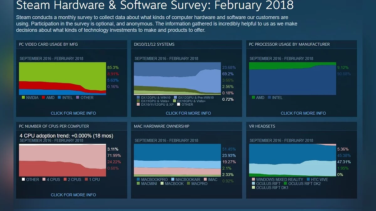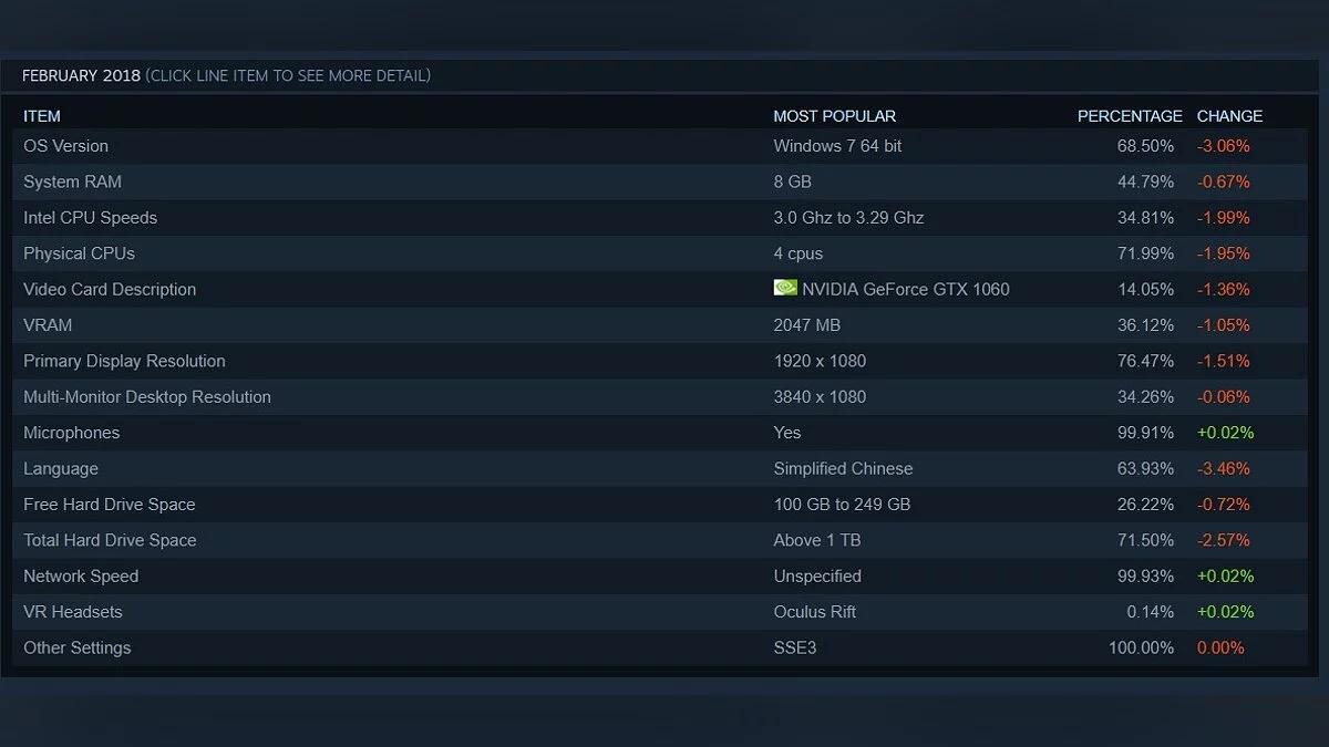 Что касается победителей, их доля составила 85,3 % у Nvidia и 90,88 % у Intel. Стоит также добавить, что самой популярной операционной системой по-прежнему является Windows 7 (x-64). Что касается железа, то здесь можно увидеть следующие результаты: Nvidia GTX 1060 — самая популярная видеокарта, Oculus Rift стал востребованнее HTC Vive, а четырехъядерные процессоры до сих пор остаются доминирующими на рынке.