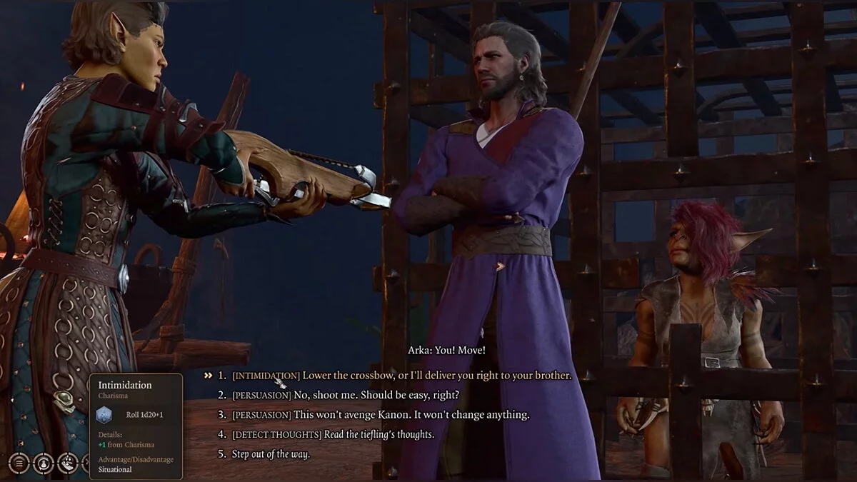 - Запугивание: «Опусти арбалет, или встретишься с покойным братцем». Во время броска кубиков нужно получить 10 очков харизмы или больше. Рискованный вариант, ведь если у вас не получится, то тифлинги нападут на ваш отряд. Рекомендуем использовать его в крайнем случае, если остальные способы не сработали.