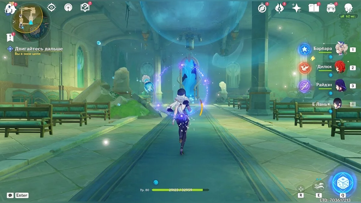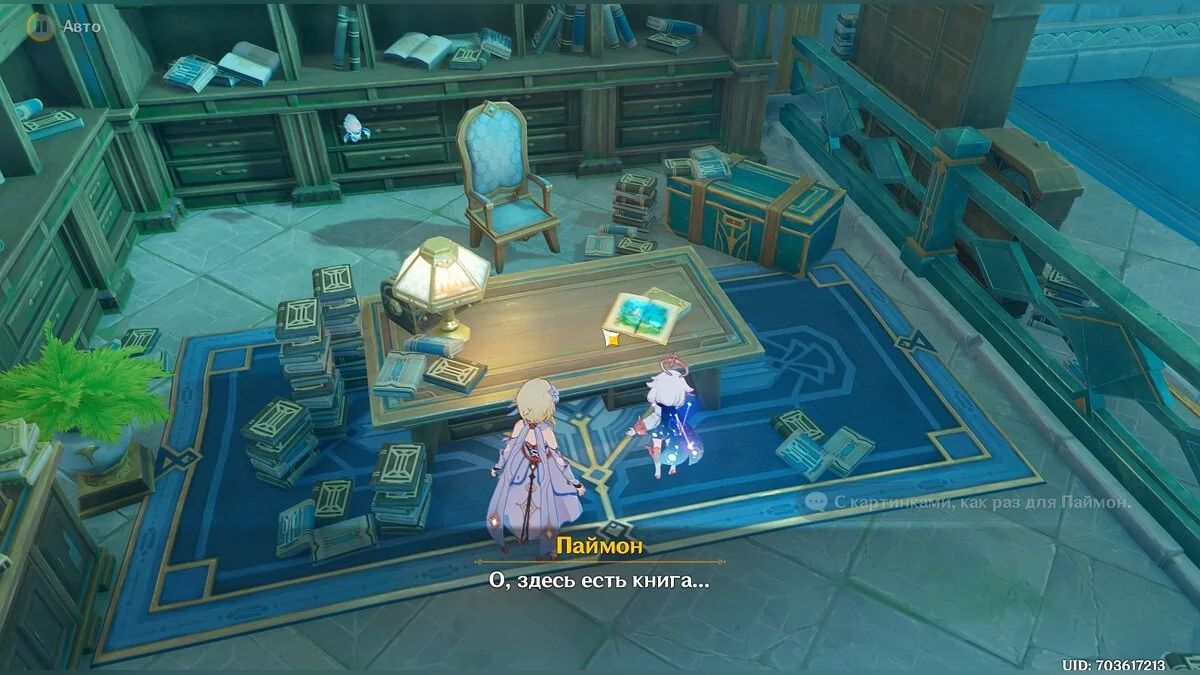 Бегите в открывшийся проход и садитесь в лифт, затем осмотрите богатый сундук. Так вы окажетесь в просторной комнате с книгами. Паймон предположит, что это библиотека. Здесь же начнётся катсцена, а дверь, из которой вы пришли, закроется. В этой комнате есть несколько гидрогранумов, с помощью которых можно активировать и снова пробежать по ранее изученным локациям.