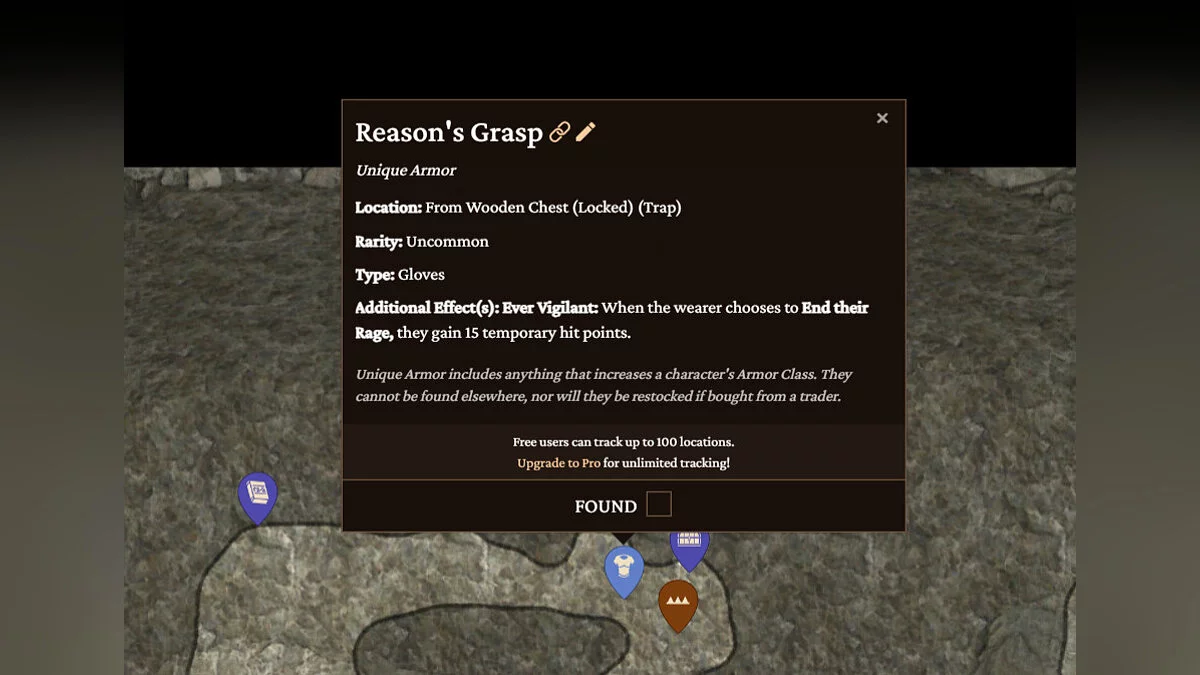 Сервис Map Genie позволяет не только отмечать нужные категории, но и дает описание некоторым меткам. Например, вы можете выделить на карте уникальные аксессуары, а затем просмотреть метки, увидев описание каждого предмета. Таким образом, исследовав некоторые категории, вы вправе найти множество уникальных предметов для вашего отряда и узнать их характеристики.