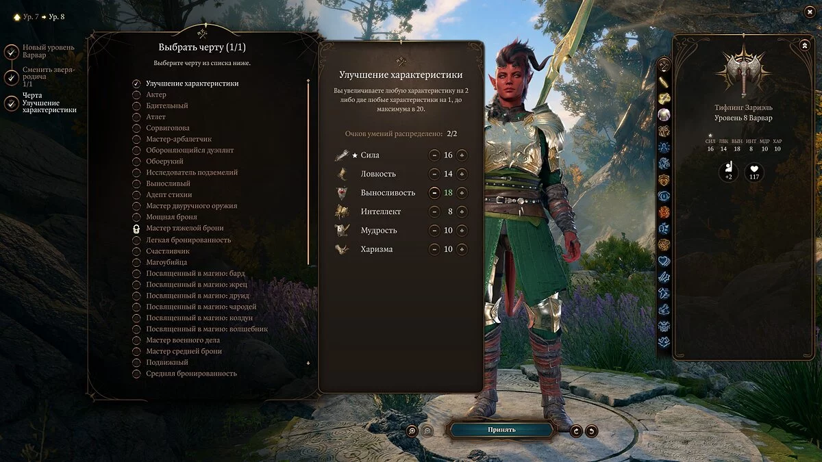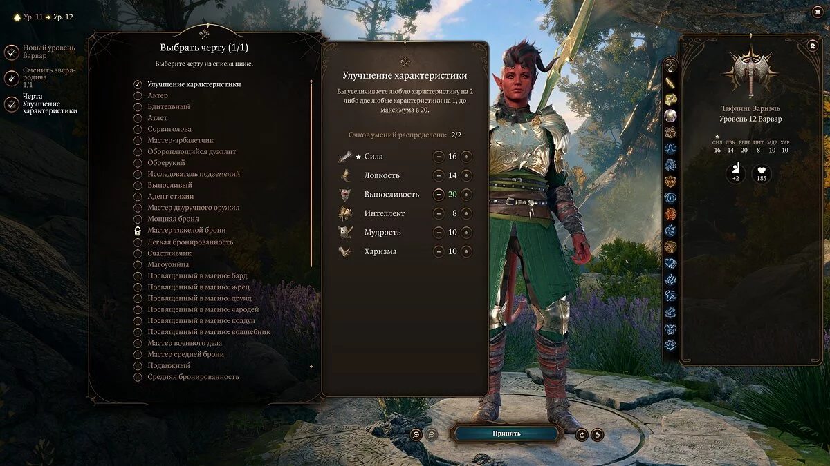 В отличие от танка, нам не настолько принципиальна «Выносливость», как урон, а потому выбираем «Улучшением характеристик», повышаем «Силу» до 18 и радуемся тому, как теперь условная Карлах дамажит в состоянии «Бешенства» и даже без него.
