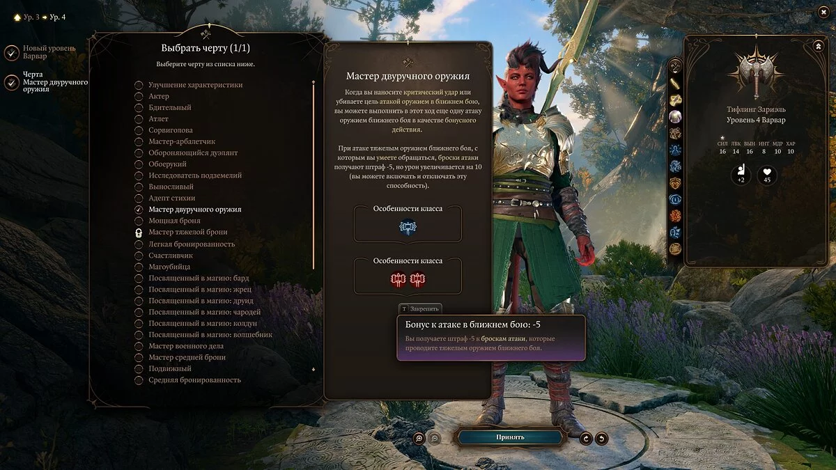 «Мастер двуручного оружия» — настоящее спасение для вас в том случае, если хороший урон необходим, а заряды «Ярости» по стечению обстоятельств закончились. При небольшом штрафе в -5 к попаданию вы получаете +10 к урону. Это дает вам возможность чувствовать себя комфортно в любой ситуации.