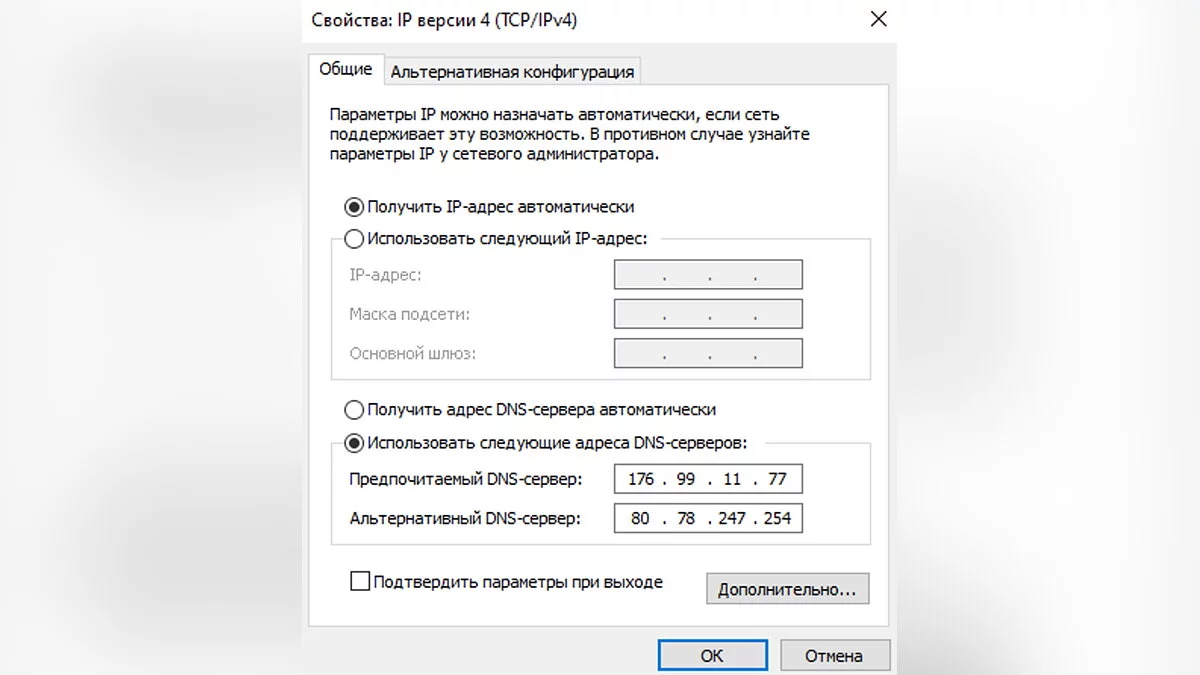 - Внизу вы увидите пункт «Использовать следующие адреса DNS-серверов». В первую строчку введите значение 176.99.11.77, а во вторую — 80.78.247.254.