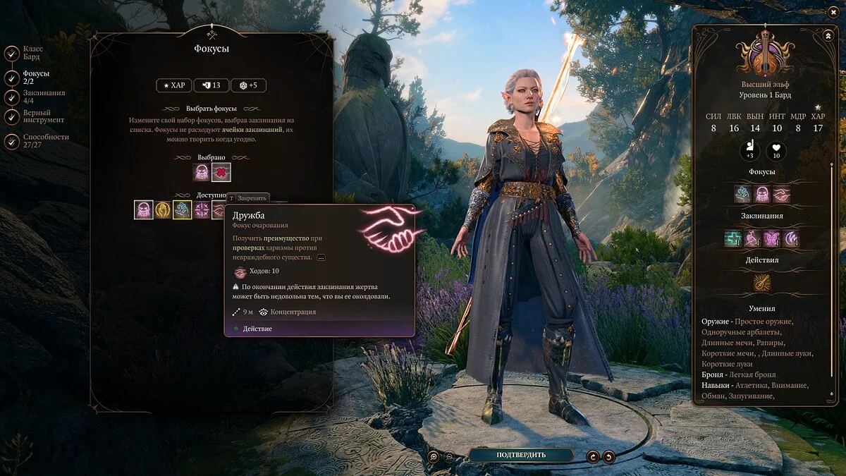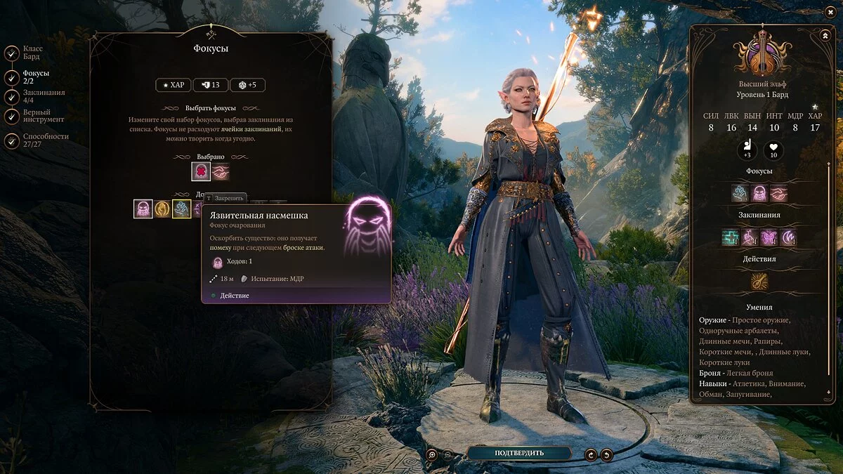 Фокусы на первом уровне выбираем следующие: «Язвительная насмешка» и «Дружба».