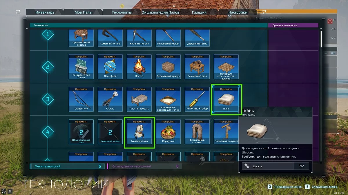 Для создания ткани и одежды также нужно повышать уровень героя и вкладывать очки технологий на соответствующей вкладке (нажмите кнопку «TAB» на ПК и перейдите на вкладку «Технологии»):