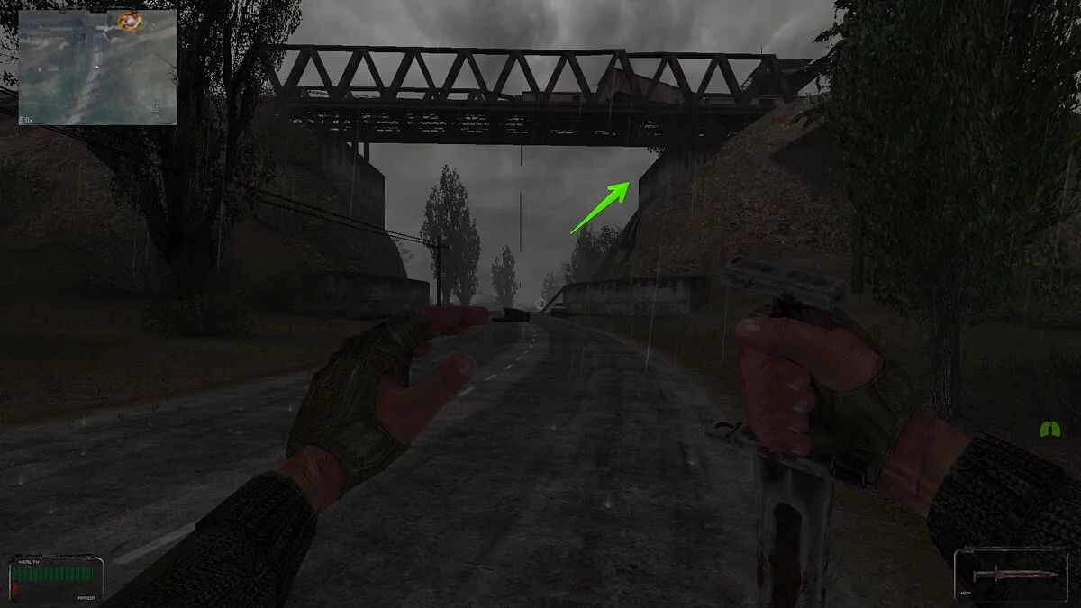 Бегите к аномальному тоннелю и поговорите со сталкером, который ждёт здесь. По пути вы можете наткнуться на крыс — они небольшие, но нападают стаями и наносят серьёзный урон. Убить их проще всего выстрелами с пистолета, поскольку попасть с ножа может быть проблематично.