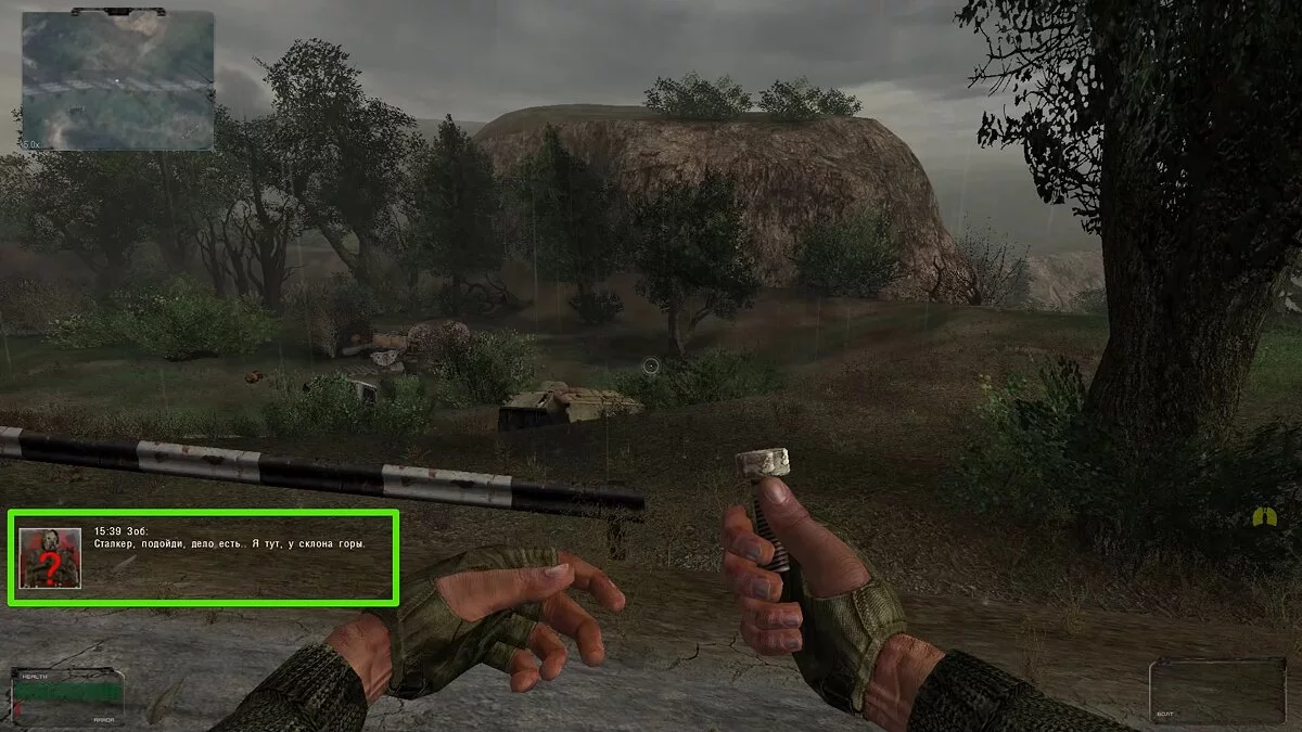 Когда вы будете идти обратно к торговцу с артефактом, то получите сообщение от неизвестного сталкера. Он будет ждать у склона неподалёку от тоннеля с аномалиями. Побеседуйте с ним (предварительно уберите оружие) и согласитесь помочь. Парень расскажет историю о том, как его ограбили бандиты, которые укрылись на заводе неподалёку.