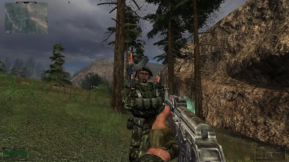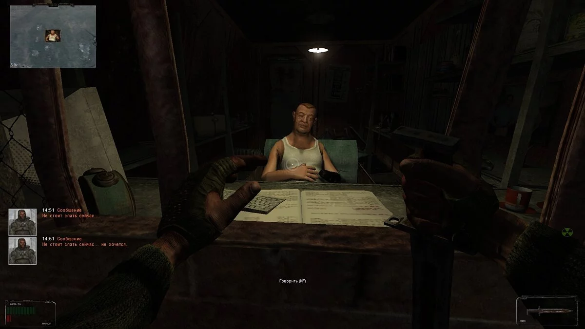 Как только военный свяжется по рации со своими, начнётся выброс. Бегите в сторону деревни и укройтесь в одном из бункеров, чтобы переждать его. Расскажите Жабе о случившемся и заберите награду. Теперь вы можете приобретать у торговца не только расходники, но и оружие, а также различное снаряжение и еду.