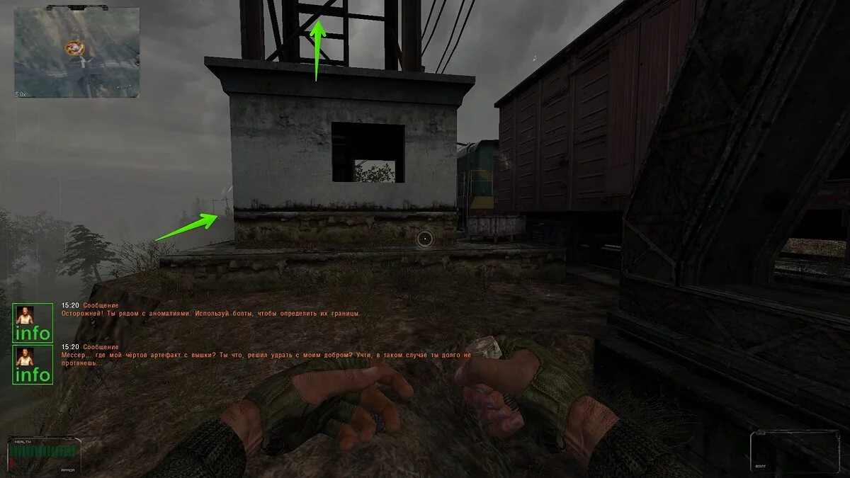 Теперь нужно отправиться к железнодорожному мосту, обойти его и подняться по противоположной стороне. Здесь есть небольшая сторожка, где и находится артефакт, однако вокруг этого здания много аномалий. Бросайте болты, активируя аномалии, чтобы пройти на первый этаж и подняться по лестнице на крышу. Заберите папку с документами (её можно выгодно продать) и артефакт на полу.