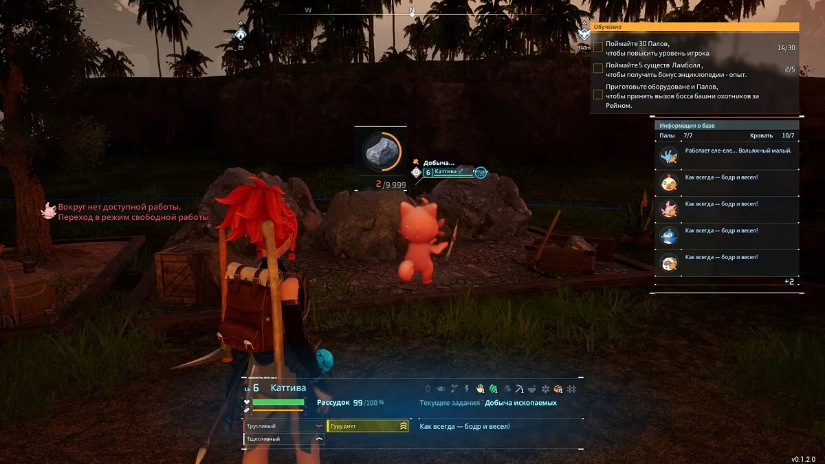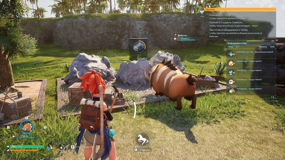 Для добычи камня палу нужно обладать навыком «Добыча ископаемых» (с иконкой кирки). Одними из первых вы встретите Каттиву или Рашоа — последнего можно использовать в качестве средства передвижения по миру. Вы вправе добавить на базу несколько приятелей с навыком шахтёра для увеличения производства камня.