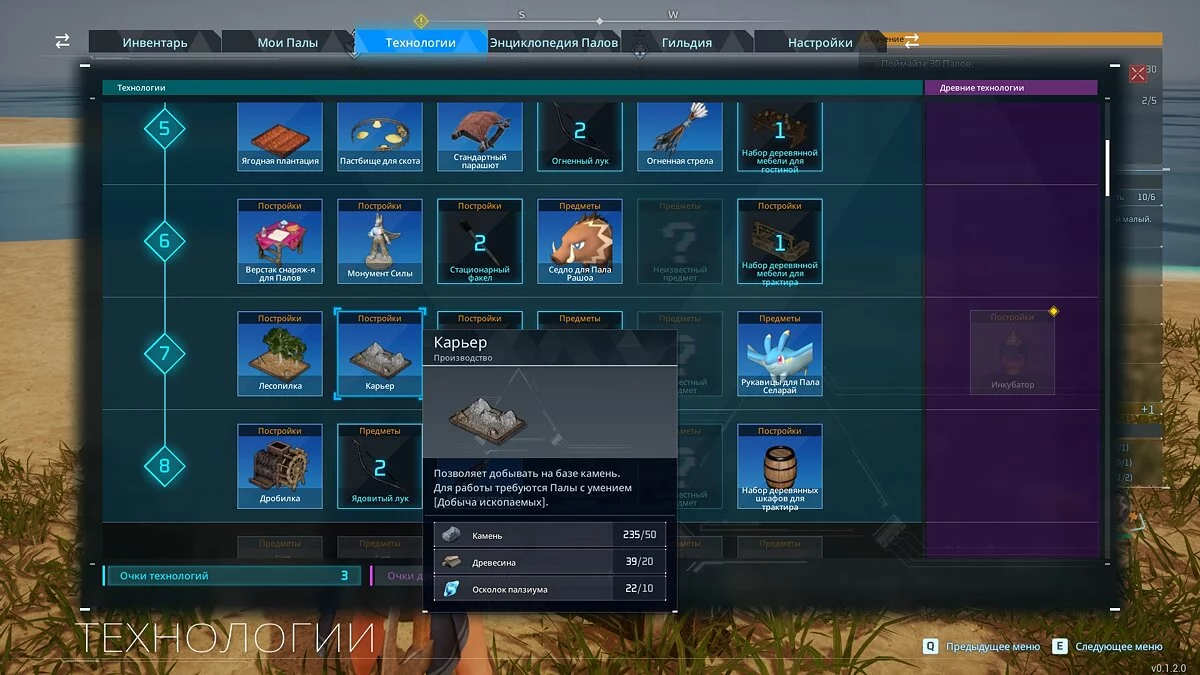 После достижения 7-го уровня базы вы откроете больше очков технологий. Их можно использовать для разблокировки новых рецептов крафта и улучшения базы. Именно на этом уровне открывается технология «Карьер».