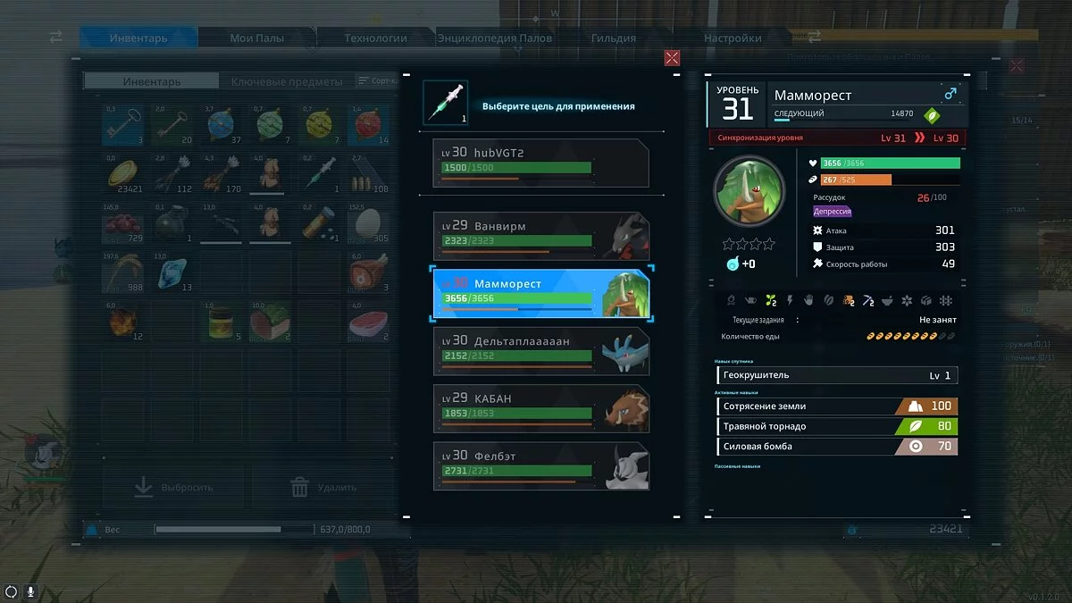 Вы также можете перетащить пала в свой инвентарь, затем нажать ПКМ на лекарство и выбрать нужное существо.