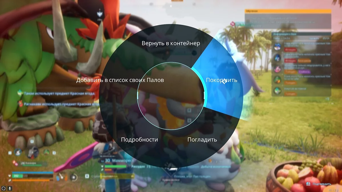 Медикаменты палы употребляют также, как и обычную еду. Если раненое или больное существо работает на базе, то просто подойдите к нему, нажмите цифру «4» на клавиатуре и выберите «Покормить». Дайте раствор зверьку, после чего статус сразу же исчезнет.