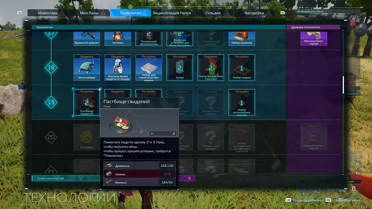 На 19 уровне вы откроете рецепт «Пастбища свиданий». Это место, куда можно поместить Палов разных полов, но одного вида. Через некоторое время вы получите яйцо с гарантированным Палом нужной породы и с более высокими характеристиками. Для пастбища свиданий потребуется: