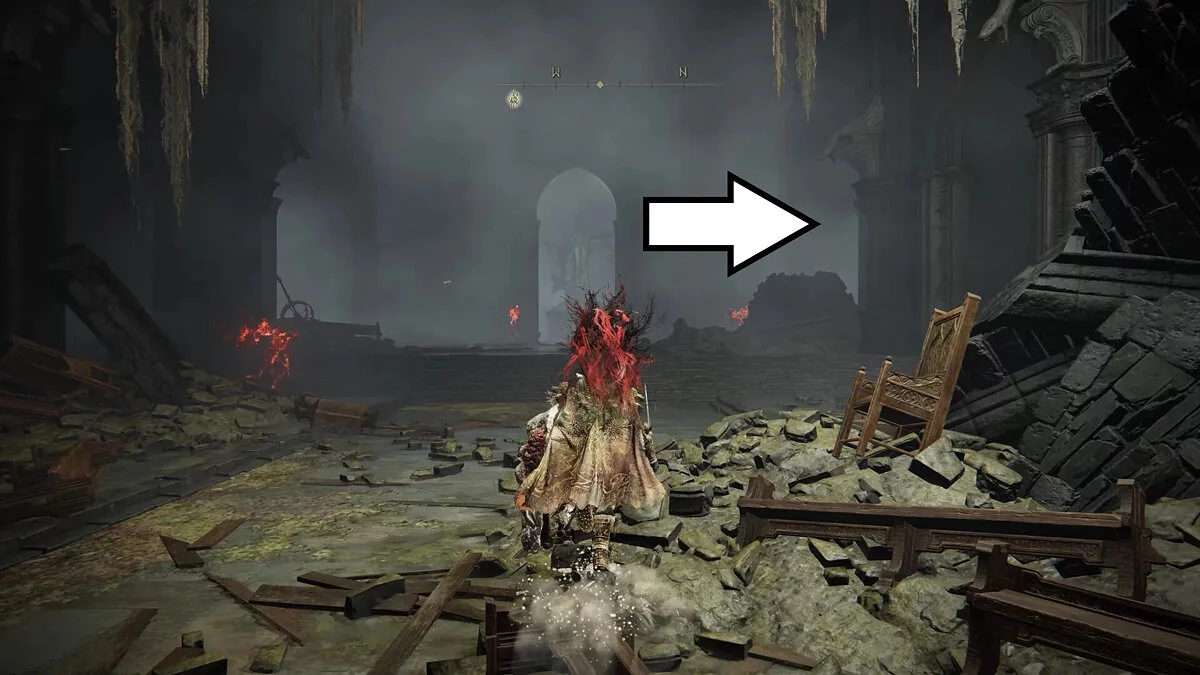 От места благодати Затонувшая часовня (Sunken Chapel) идите на запад и поверните направо, когда выйдете из здания часовни. Прокрадитесь мимо древесного духа, дремлющего на круглой площади рядом с часовней, и войдите в церковь слева (та, внутри которой находятся все взрывающиеся огненные монстры).