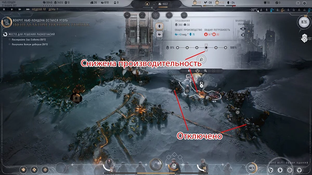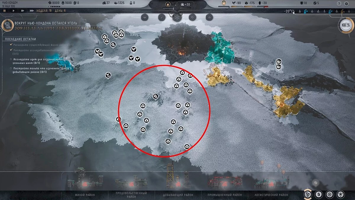 - После получения угля из ухоронки остановите/снизьте добычу угля в ваших районах, чтобы не тратить впустую рабочую силу и ресурсы — она может потребоваться на других направлениях. В целом, если склады наполнились, то далее пополняться не будут (дальнейшая добыча не идет), но рабочая сила, тепло и ресурсы будут расходоваться, как обычно.