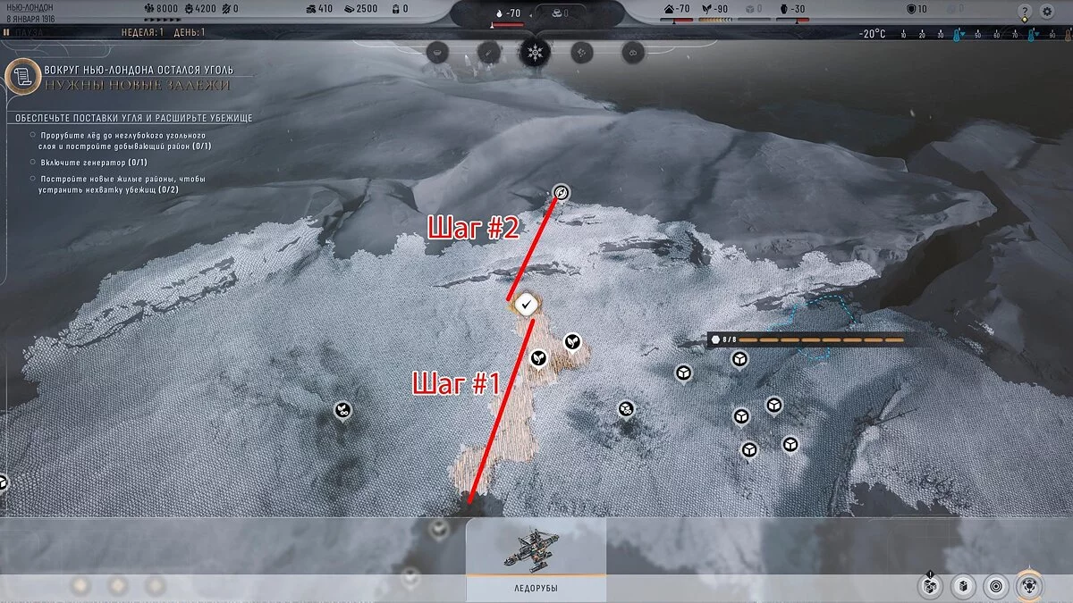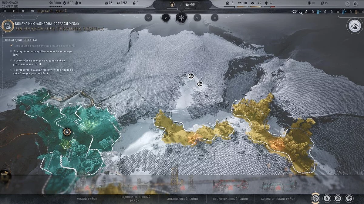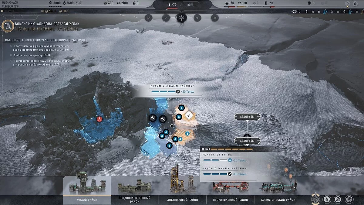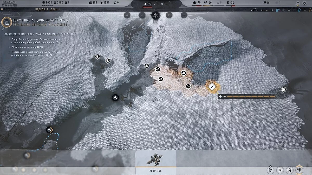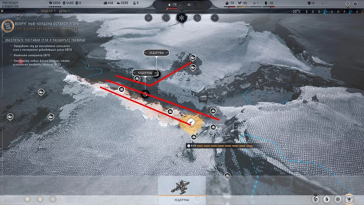 В начале кампании главным приоритетом является налаживание добычи угля — без тепла население начнет вымерзать сотнями. Пропустить этот этап никак не получится. Осложняет задачу то, что до залежей не так легко добраться, нужно сперва пропустить ледорубов. Оптимально сразу по трем «рукавам», чтобы быстрее добраться до залежей:
