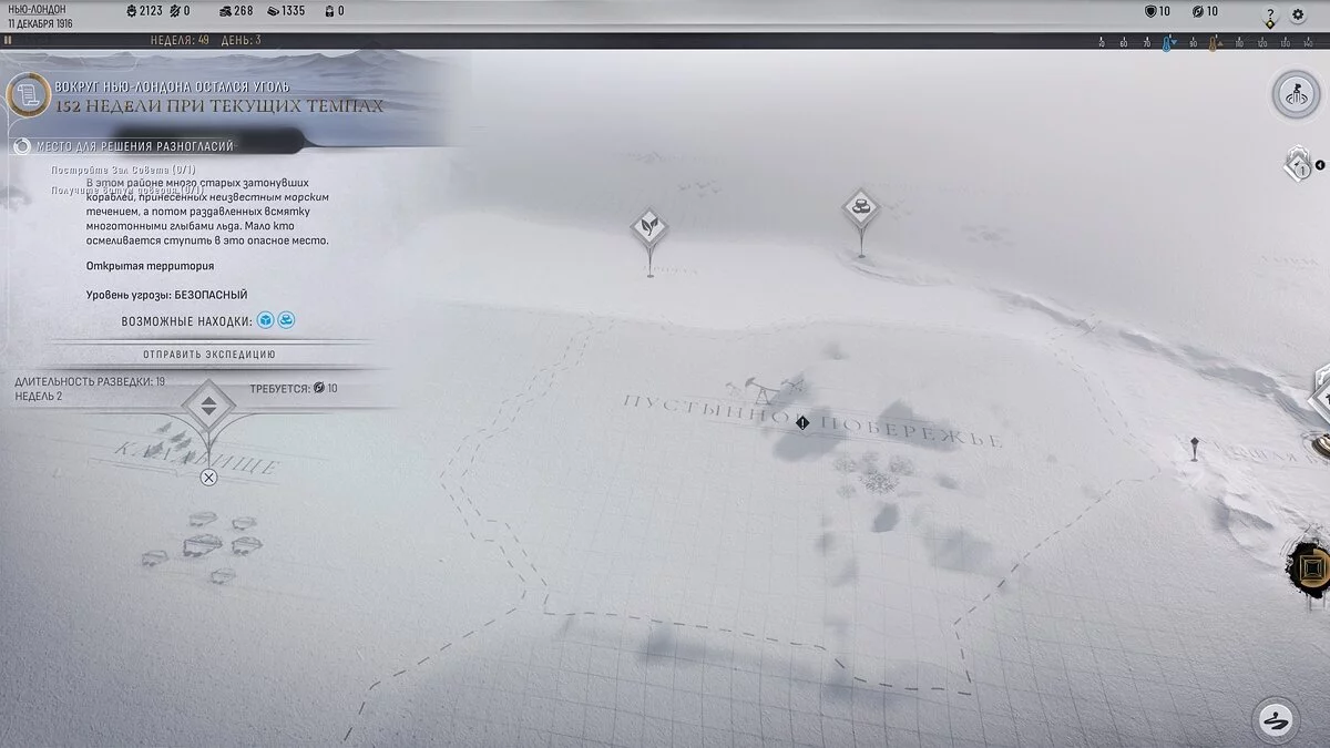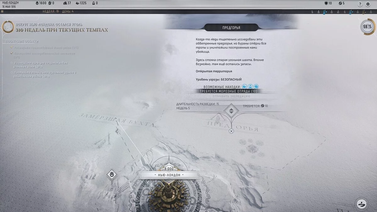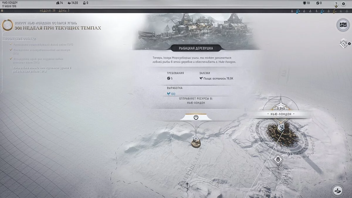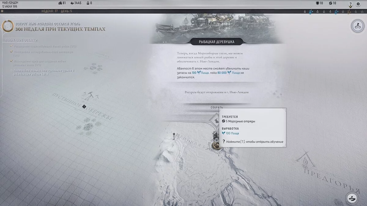 А сейчас отправьте морозные отряды исследовать Замерзшую бухту и расположенный за ней регион Причал. В Замерзшей бухте вы найдете Рыбацкую Деревню — заберите морозоборцев (это будет исключением из общего правила абзацем выше), и получите доступ к огромному запасу еды — 80 000 единиц продовольствия, которое будет питать Нью-Лондон на протяжении многих недель, затратив всего пять морозных отрядов.