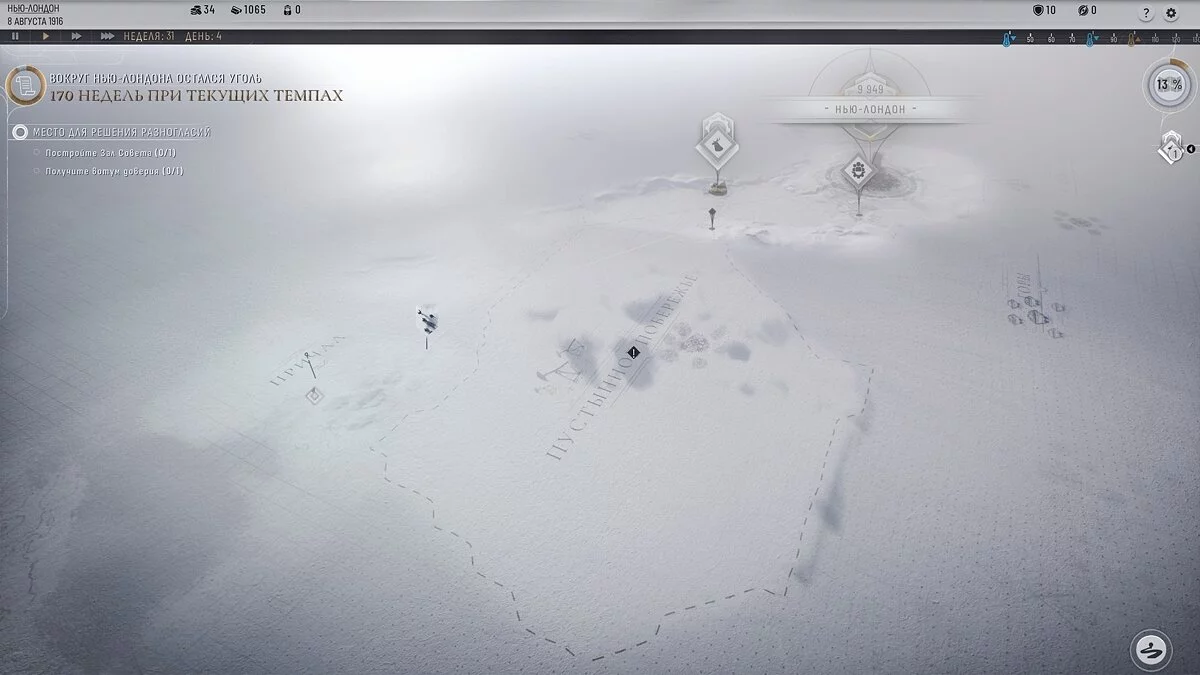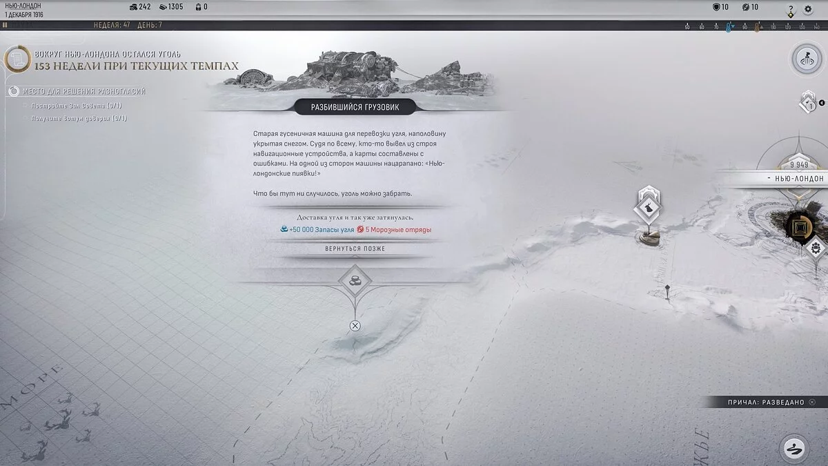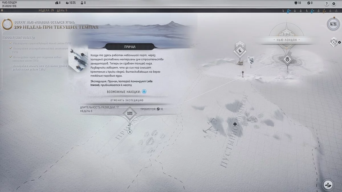 Оттуда сразу двигайтесь в Причал. Там в ухоронке лежит 50 000 угля, который можно использовать сразу. Когда запасов угля нет совсем, полезная находка, согласитесь? Это значительно облегчит развитие вашего города, высвобождая ресурсы для важных исследований и решений. Например, вы сможете отложить строительство второй шахты и потратить тепломарки на более приоритетные задачи.