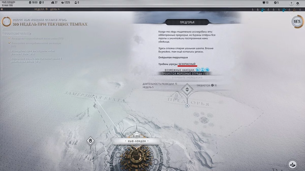 Прокликивая карту Морозных Земель и ближайших соседних районов обратите внимание на метки «уровень угрозы»: опасный или смертельный. Не ходите в эти районы. Начните с безопасных мест. Обычно это два региона — Замерзшая бухта и Предгорья. Предгорья находятся неподалеку, и там есть ценные ресурсы, а еще там будет важнейший аванпост по добыче угля, который со временем можно развить в полноценное поселение. Но это позже.