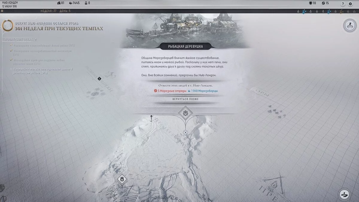 Если вы исследуете первый регион Морозных Земель и угольную шахту примерно в одно время, не забудьте проконтролировать дальнейшие разработки и исследования территорий. Игра заранее не предупреждает, когда морозные отряды освободятся после сопровождения морозоборцев из Рыбацкой Деревни. В итоге они могут бездействовать, пока вы будете распределять вновь прибывших по новым районам. Важно основать аванпост в Деревне после того, как вы забрали жителей — это отдельное действие, не связанное с сопровождением морозоборцев!