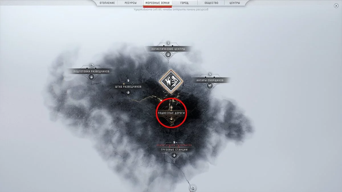 Четвертым шагом в исследованиях должна стать ветка Морозные земли → Подвесные дороги. Их проще прокладывать, ресурсы по ним идут быстрее, и с их помощью вы сможете превращать аванпосты в полноценные поселения. Расселив часть населения по новым поселениям, вы облегчите нагрузку на Нью-Лондон и сделаете развитие более устойчивым.