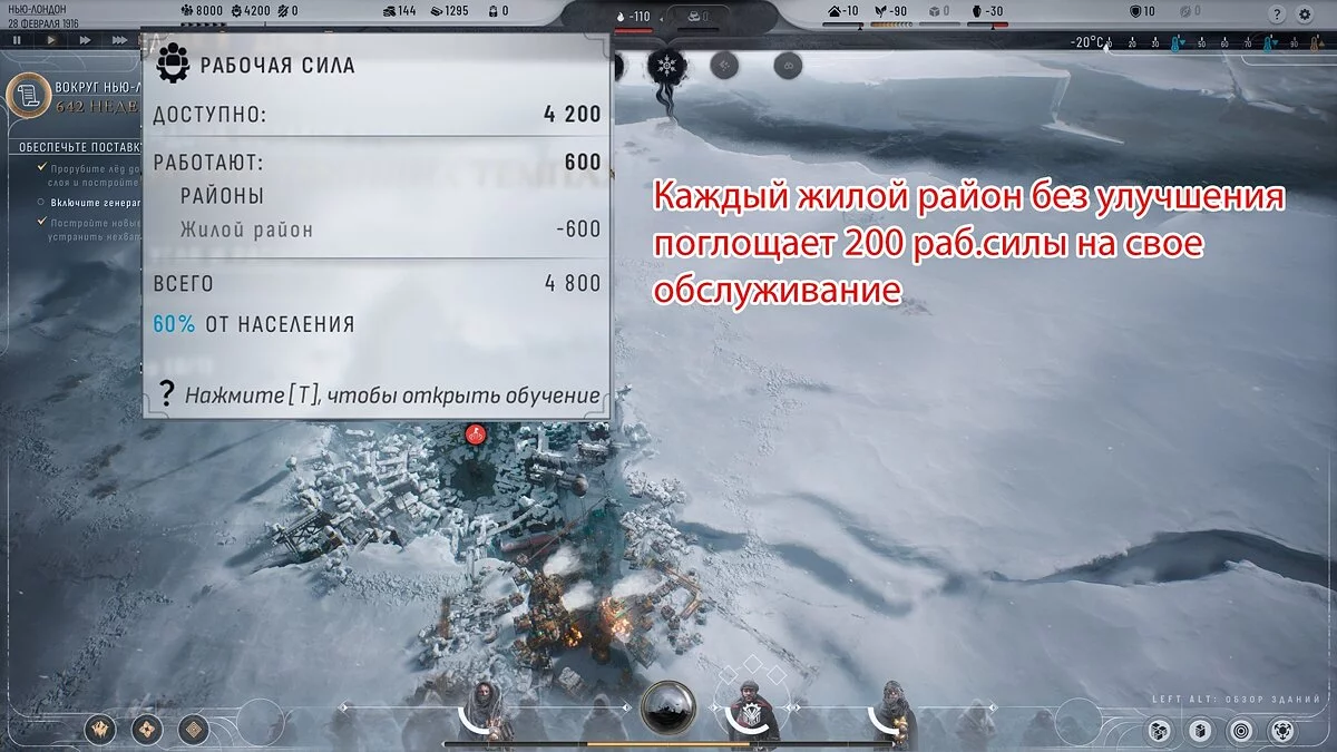 Итак, вы вышли в Морозные Земли и осмотрелись. Что делать в первую очередь? Скажу сразу: не приглашайте жителей из внешнего мира в город раньше времени. Когда придет время? Например, когда нужно построить поселение или колонию, а у вас и без этого нет рабочей силы. В первые недели может казаться, что рабочих недостаточно, но с этим можно жить. На 45-50-й неделе население города вырастет по скрипту. Подождите этого момента, чтобы избежать перенаселения и связанных с ним проблем, таких как нехватка ресурсов и перегрузка инфраструктуры.