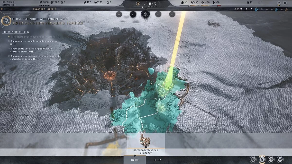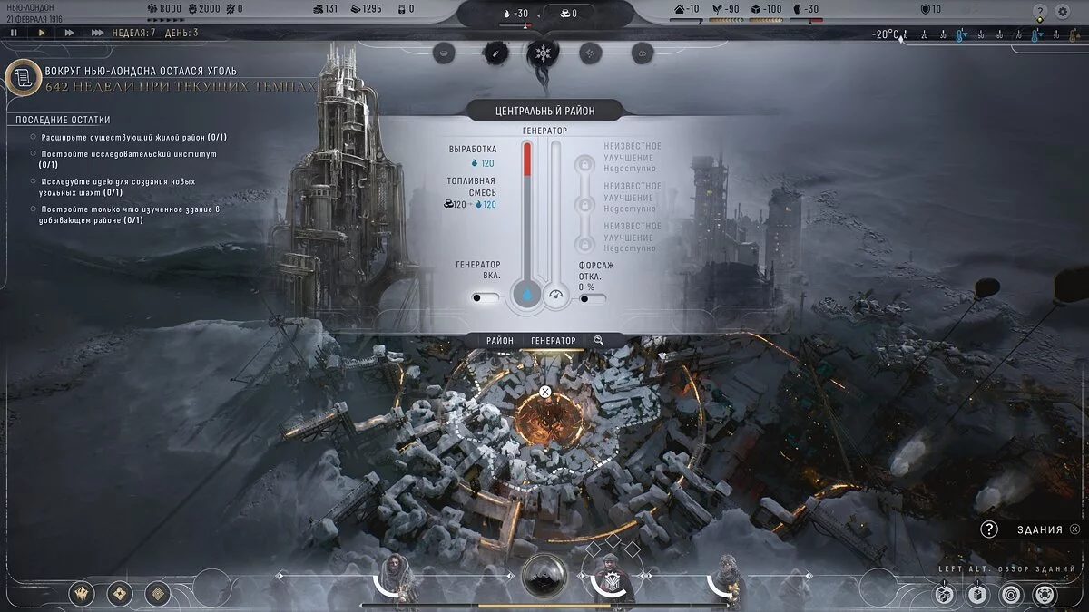 Логистический район готов? Теперь ваша цель — найти уголь в Морозных Землях, чтобы генератор мог работать на полную мощность к ближайшим морозам. В идеале, завершите строительство логистического района и Института одновременно.