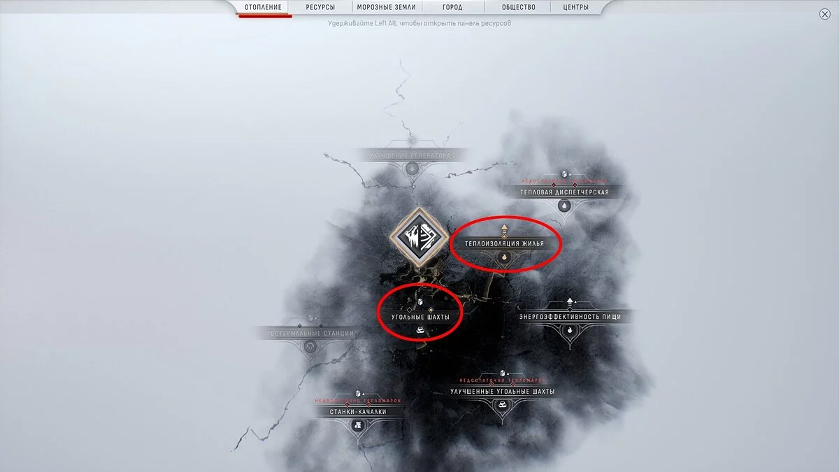 Первым делом сосредоточьтесь на исследованиях, связанных с отоплением: Отопление → Угольные шахты → Подрывные угольные шахты и Отопление → Теплоизоляция жилья → Асбестовая облицовка. Как бы вы ни старались, быстро добраться до запасов угля не получится, а первое похолодание уже не за горами. Добывающие районы не справятся с обогревом без угольных шахт, поэтому вам понадобится хотя бы одна шахта, чтобы обеспечить город теплом. Утеплитель же существенно сократит расходы угля на отопление домов, что важно из далеко идущих соображений.
