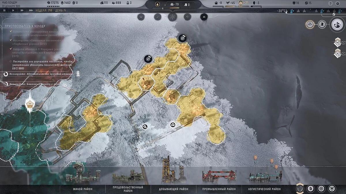 Дальше останется только улучшать и расширять инфраструктуру, укрепляя позиции города. Исследуйте в Морозных землях все доступные безопасные территории, и закладывайте, по возможности, поселения, так как они добывают ресурсы на постоянной основе, т.е. помогают в долгосрочной перспективе. Начните привлекать на эти работы население из Морозных Земель. Впереди вас ждет буран, но как не вызывать его раньше времени, как утеплить город и сколько ресурсов нужно, чтобы пережить похолодание? Рассказываем в следующем гайде.
