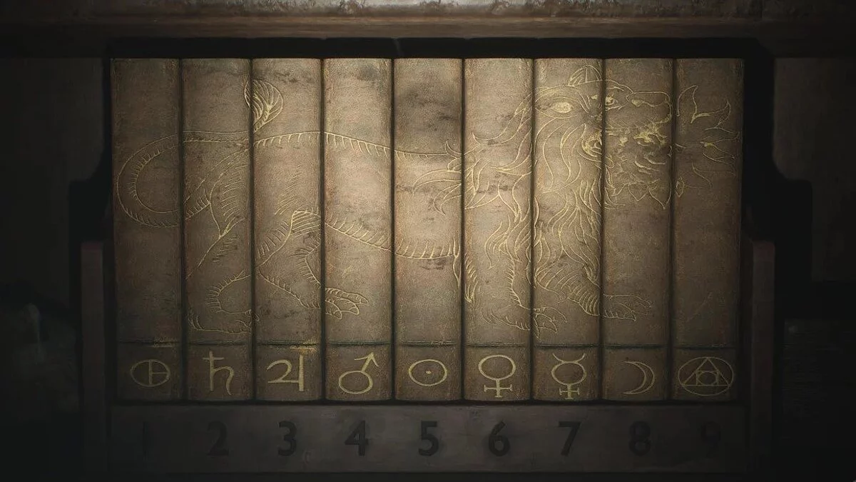 Возвращайтесь в кабинет директора на втором этаже. Поместите третий браслет на руку-головоломку. Обратите внимание на саму скульптуру. На ней есть следы, которые повторяют очертания найденных браслетов. Сверху вниз поместите: окровавленный с маркировкой и грязный браслет. Теперь совместите их с отметками на руке. Решив головоломку, вы получите ключ от хранения. Его нужно применить на двери, которая находится напротив точки сохранения. Там вы найдете кнопку от сейфа и полку с книгами, которые нужно расставить в правильном порядке. Обратите внимание на «кусочки льва» на корешках книг. После правильной расстановки вы получите шифр с цифрами. Запишите символы с числами: 92, 45, 71. После этого вернитесь к сейфу и введите символы.