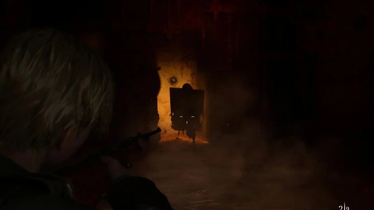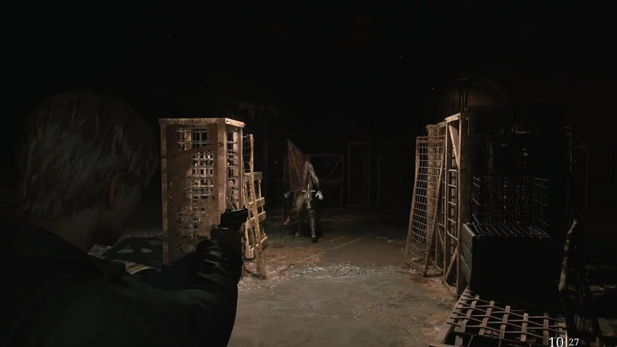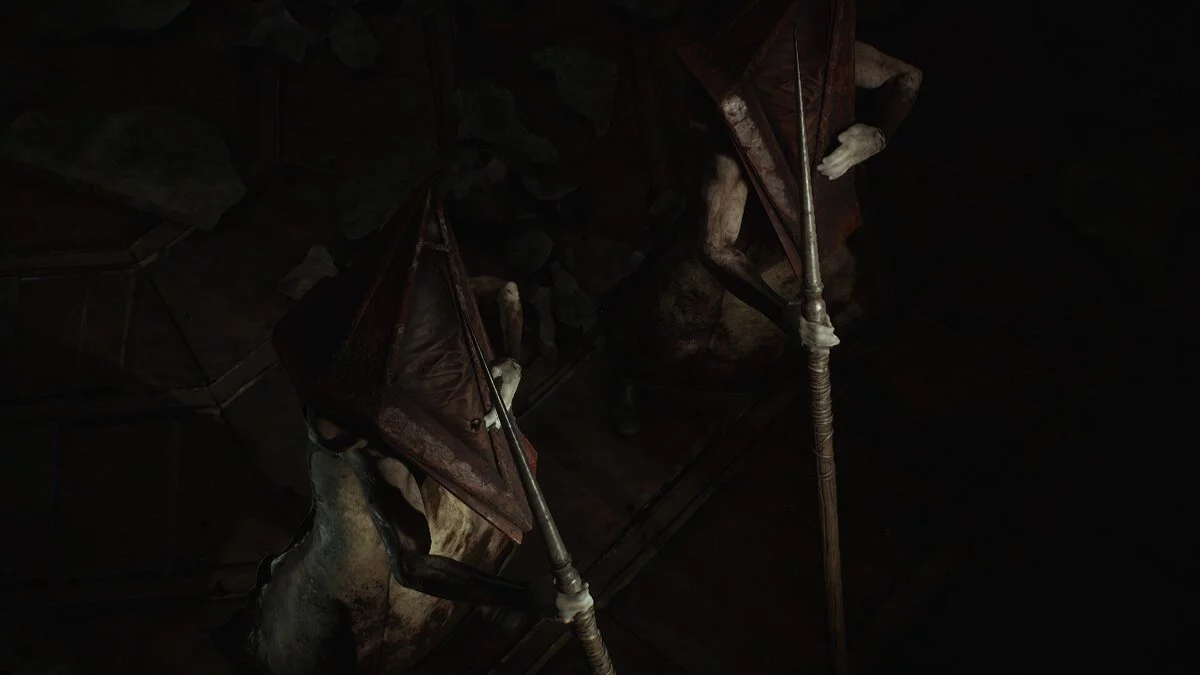 Пройдите через двойные двери, чтобы начать битву с двумя боссами одновременно. У противников вместо мечей будут копья. Старайтесь держаться от них подальше и стрелять. Иногда Пирамидоголовые будут кидать копья, поэтому старайтесь держать кнопку уворота на готове. Бой очень простой. Главное — старайтесь не промахиваться и не подпускайте боссов к себе. После битвы начнется катсцена. Возьмите яйца из рук Пирамидоголовых и вставьте их дверь. Откроется проход, который ведет к длинному коридору. В самом конце будет зона с большим количеством патронов и лекарственными средствами. Заберите все, что можете унести. Сверните направо и идите прямо. Возьмите странную фотографию.