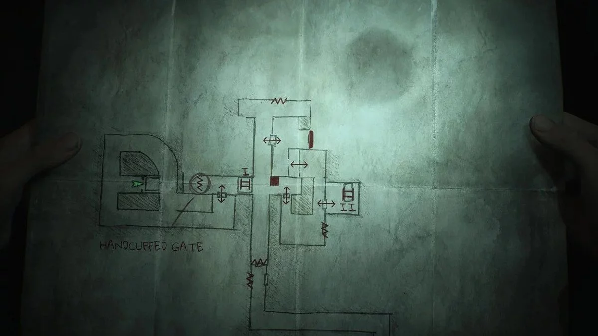 Пройдите через трубы по левой стороне. Вы увидите еще один проход справа на полу. Спускайтесь вниз, чтобы попасть в уборную. Вам необходимо попасть в раздевалку, где лежат припасы и скомканная записка на скамейке. Теперь идите в душевую зону. Обыщите локацию и соберите патроны. Прижмитесь к правой стене от входа в душевую и пройдите прямо до заплесневелой части стены. Взаимодействуйте с предметом, чтобы получить воспоминание. Сбоку будет отверстие, в которое вы должны засунуть руку. Сделайте это три раза, чтобы получить тяжелую гирю. После этого локация наполнится врагами. Покиньте зону или сразитесь с противниками.