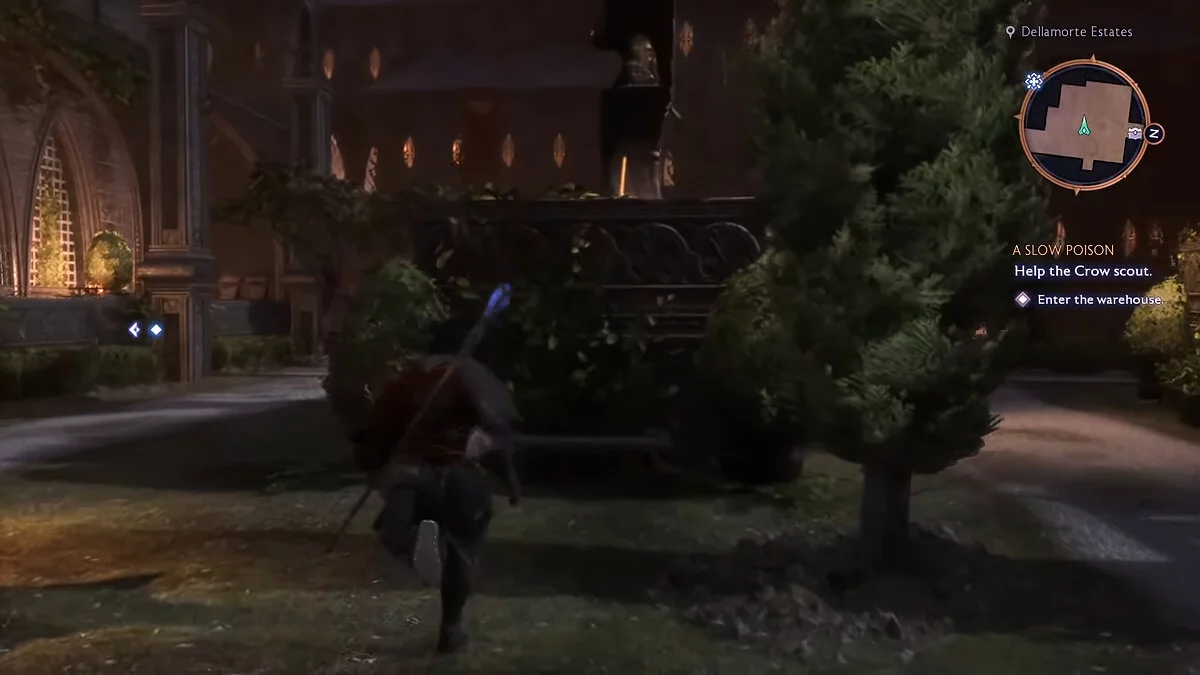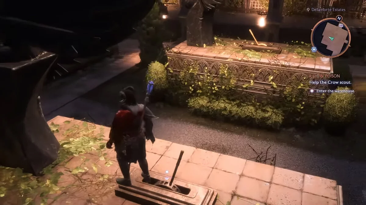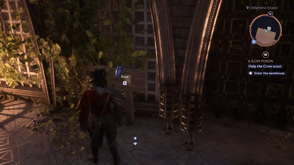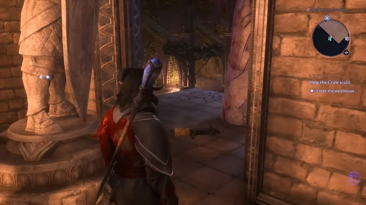 После завершения пролога и беседы с вашими спутниками вам следует покинуть главное здание библиотеки и выйти во двор. Направляйтесь на север карты, обходя слева к зданию с дверью, покрытой виноградными лозами, известному как «Мастерская».