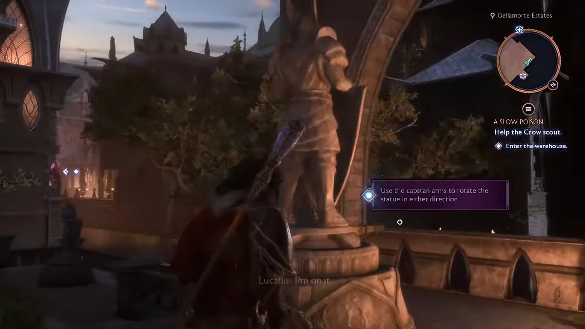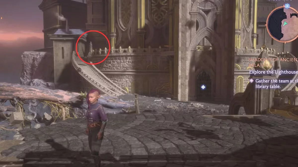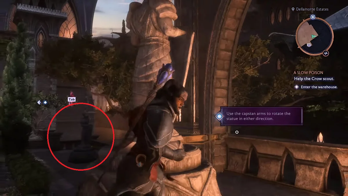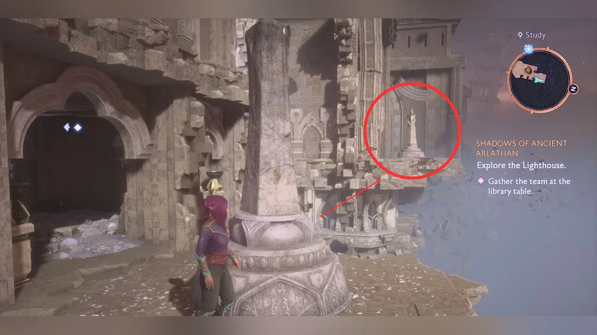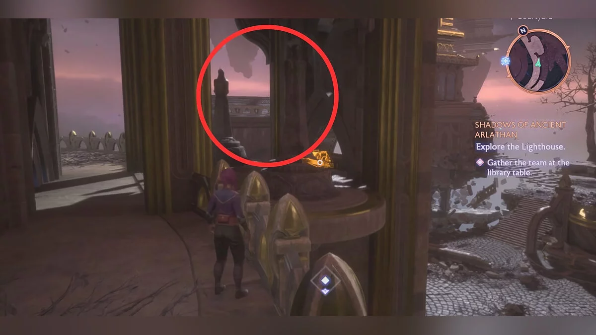 Поверните эту статую на запад, чтобы ее лицо смотрело на библиотеку. Именно в этом направлении вам нужно будет двигаться, чтобы найти близнеца статуи. Вам нужно подняться по внешней лестнице библиотеки, чтобы добраться до неё.