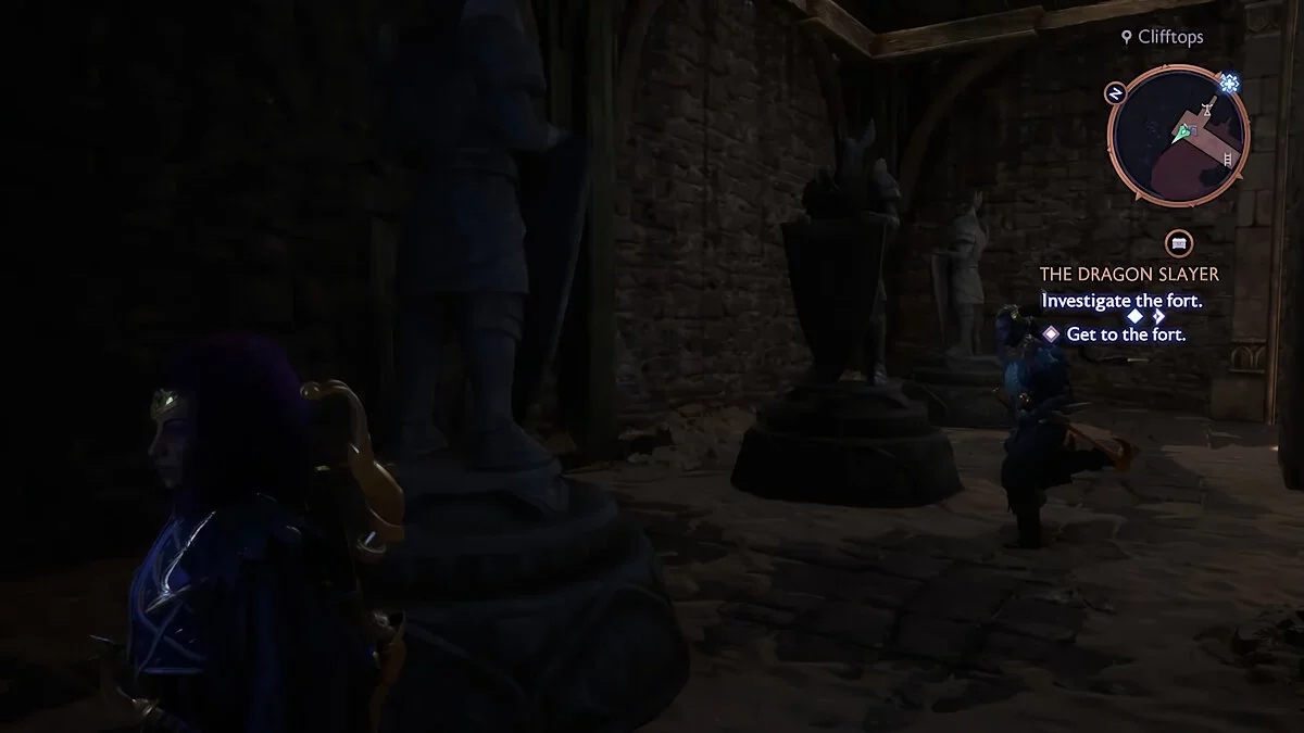 Отправляйтесь внутрь крепости, чтобы найти четыре статуи, расположенные рядом друг с другом. Рядом с каждой статуей находятся щиты, на которых указаны имена рыцарей. Ваша задача — правильно повернуть каждую статую, чтобы они смотрели в нужные направления. Обратите внимание на щиты, чтобы сопоставить имена и повернуть их в нужном направлении:
