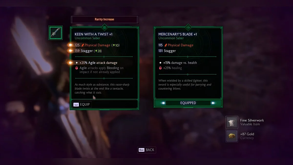 Вы можете взять дубликаты Brawler's Decorated Leathers и Weisshaupt's Wall, чтобы повысить их редкость. Кроме того, в более крупном богато украшенном сундуке вы найдете уникальный длинный меч Meredith's Legacy:
