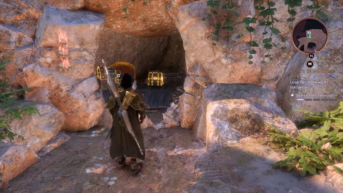 Слева от последнего факела вы увидите, как стена внутри скалы начнёт медленно опускаться вниз. Войдя в это помещение, вы обнаружите несколько сундуков, содержащих полезное снаряжение, а также немного золота. Эти находки могут оказаться весьма ценными для вашего дальнейшего путешествия, так что не забудьте пополнить ими свой инвентарь.