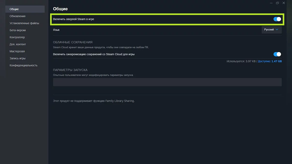 - На вкладке «Общие» установите или снимите флажок «Включить оверлей Steam в игре».