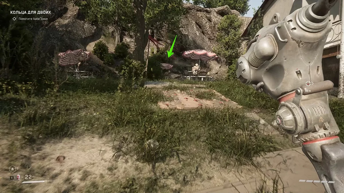 Продолжайте подъем на возвышенность. Когда побеседуете с роботом Тереньтием и расправитесь с десятком зомбированных, в конце концов окажетесь на полянке рядом с избой бабы Зины. Слева есть здание, а ещё левее три столика с зонтами. Осмотрите столик посередине, чтобы найти этот коллекционный предмет.