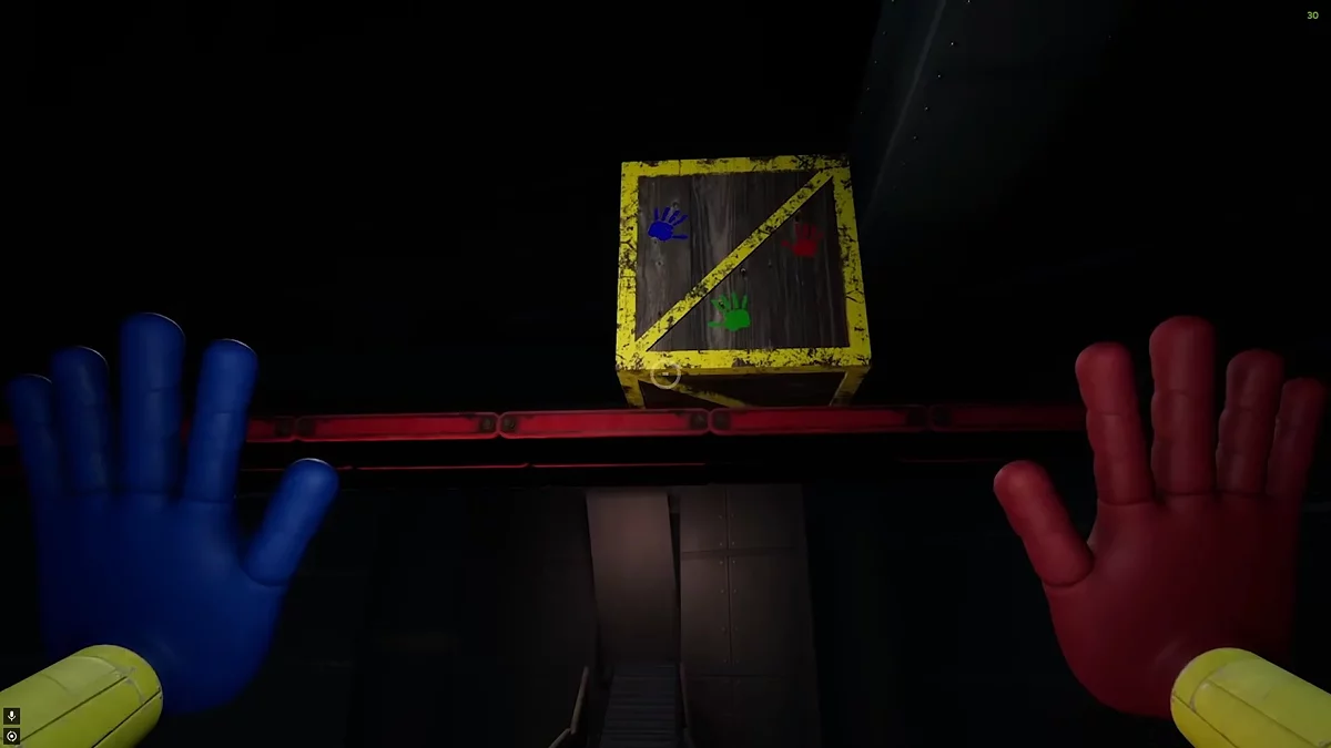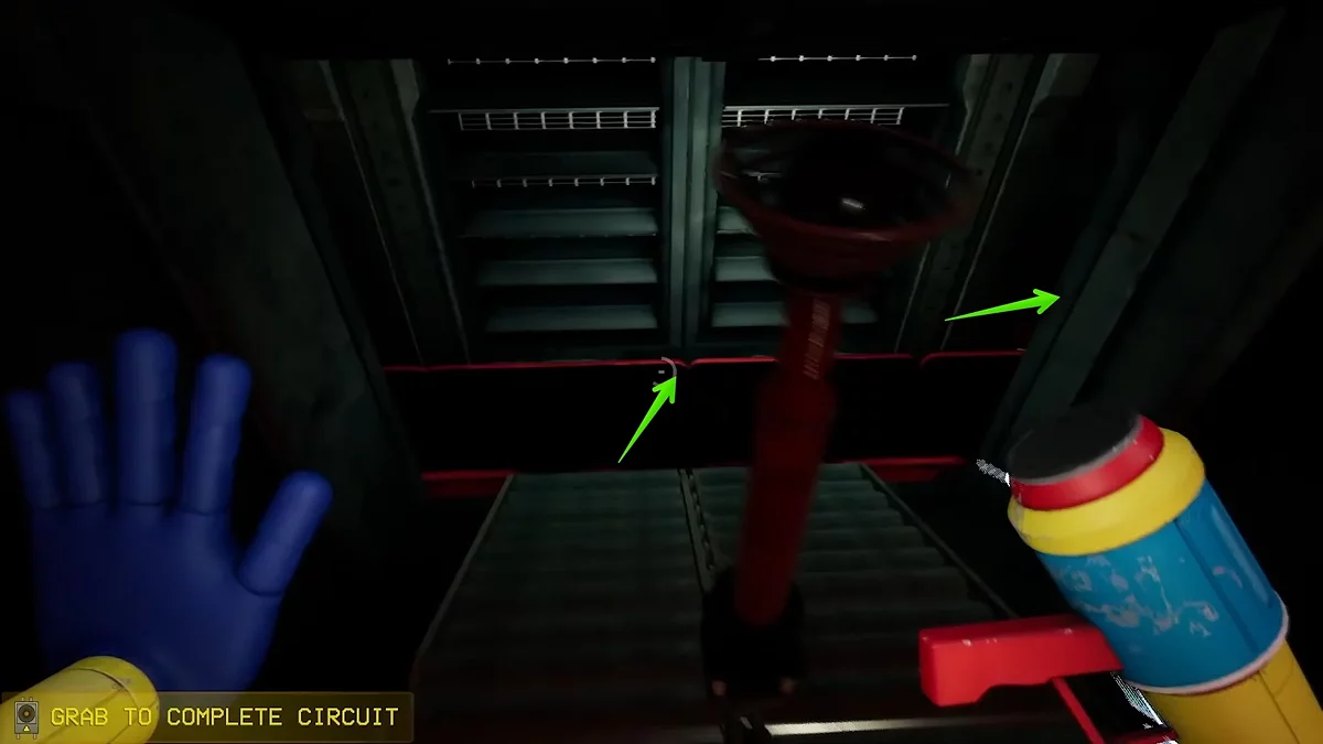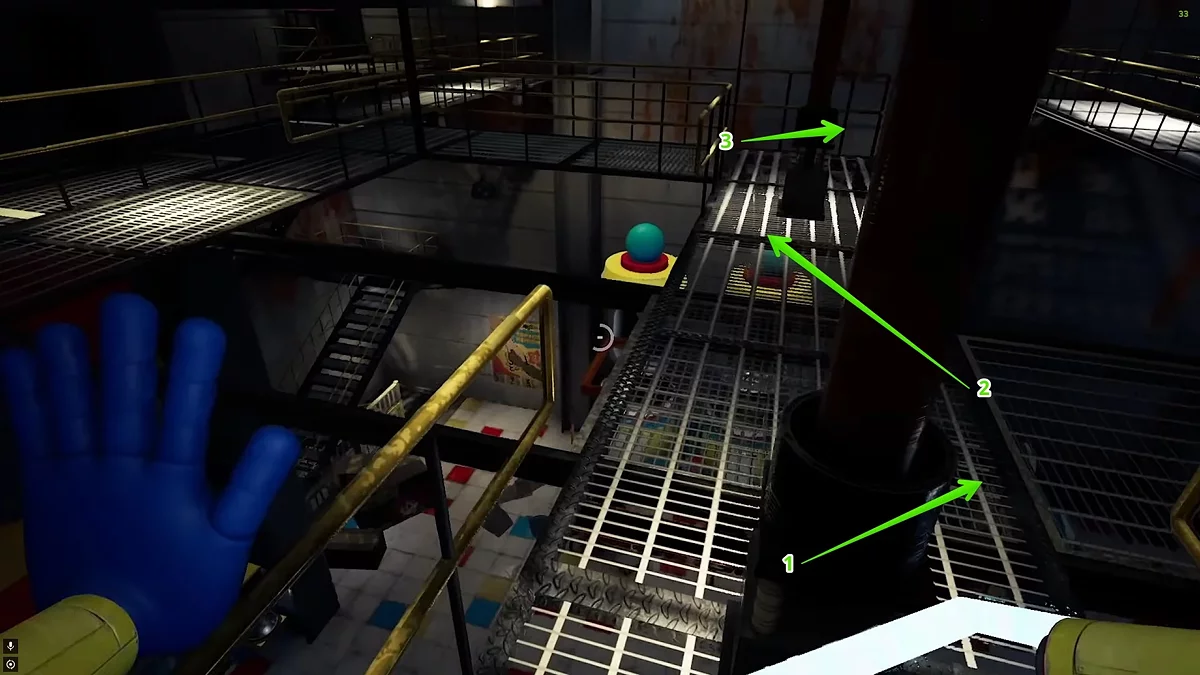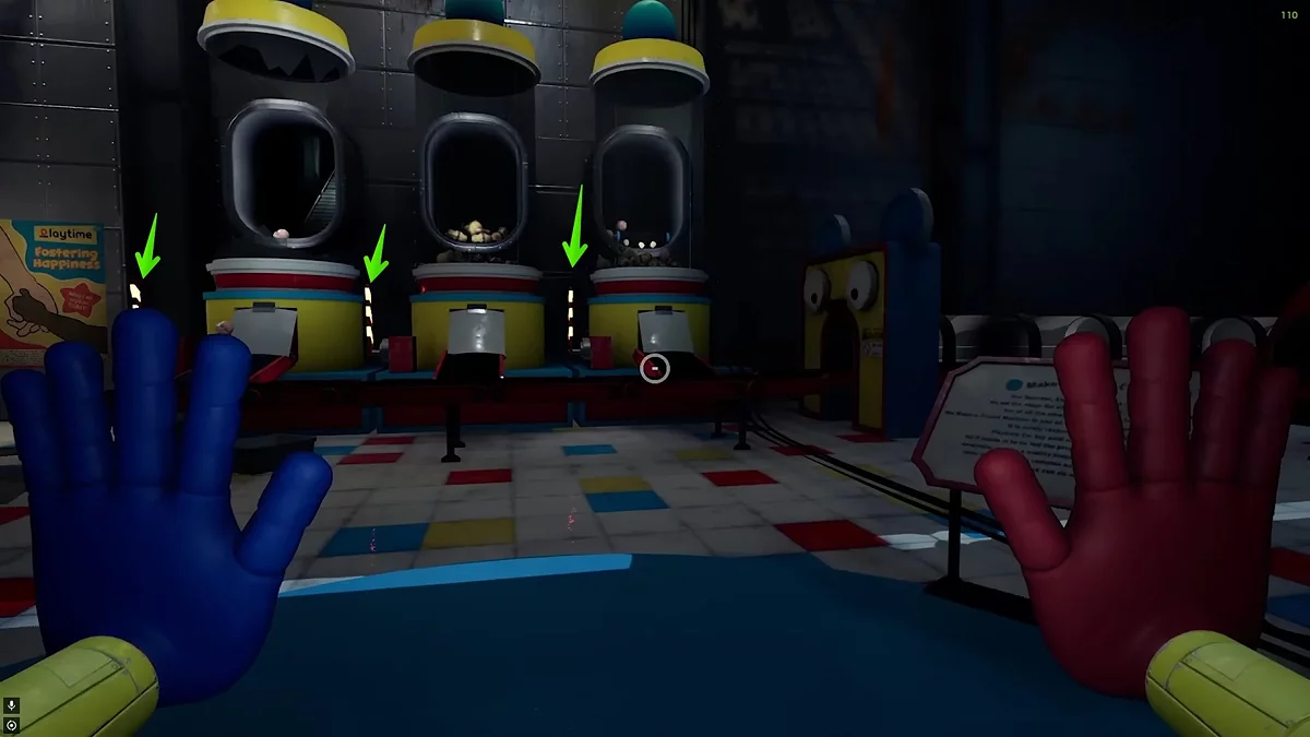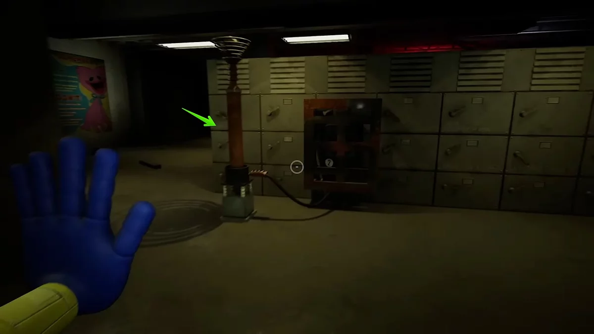 Следуйте вперёд по конвейеру, пока не окажетесь в комнате для производства игрушек. Чтобы активировать механизмы, необходимо сперва подать электричество. Для этого поднимитесь по металлической лестнице и подтяните к себе платформу. Справа на стене вы увидите розовую видеокассету.
