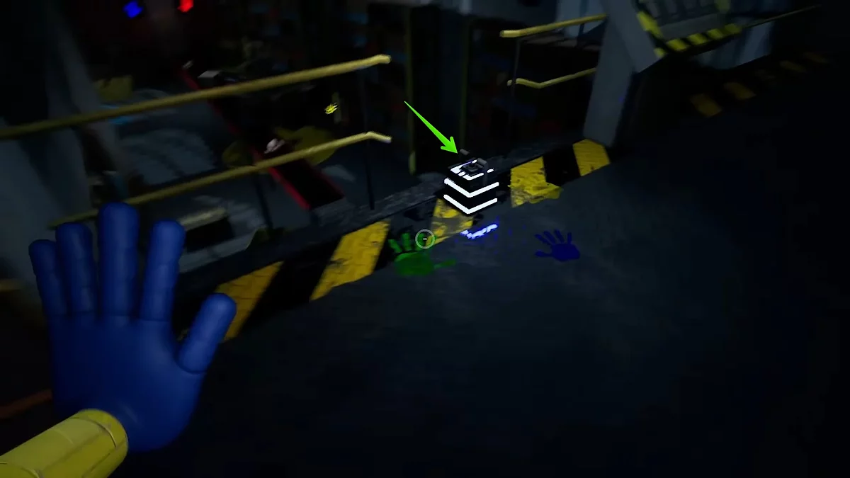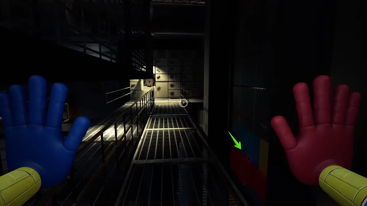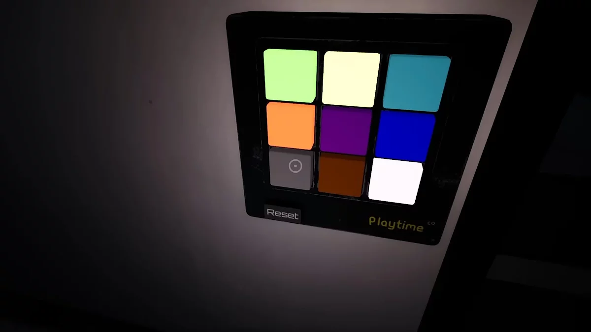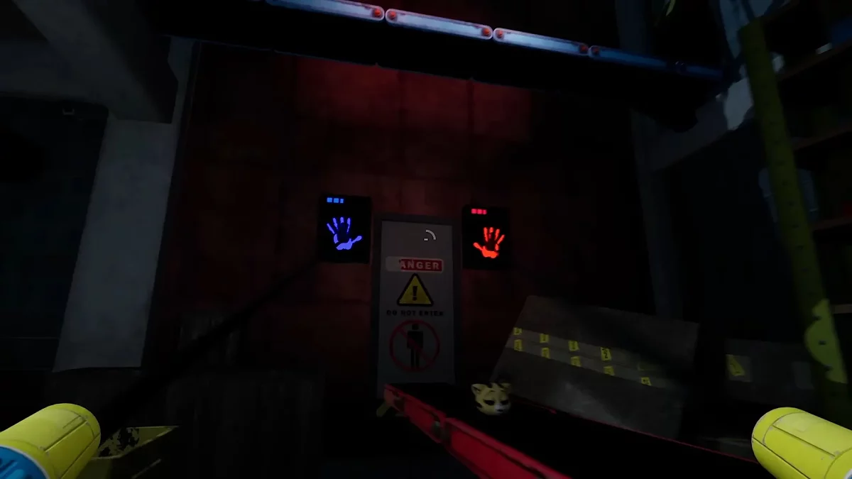Помните изображение синей руки в предыдущем зале? Нужно вернуться и взаимодействовать с ним, чтобы открыть очередной проход. Сделав это, доберитесь до двери с надписью «05». Вы попадёте в комнату с мусорными контейнерами и желтым видеопроигрывателем. Заберитесь наверх и осмотрите пульт управления. Сюда нужно отыскать четыре элемента определённых цветов, первый как раз ждёт слева от него.