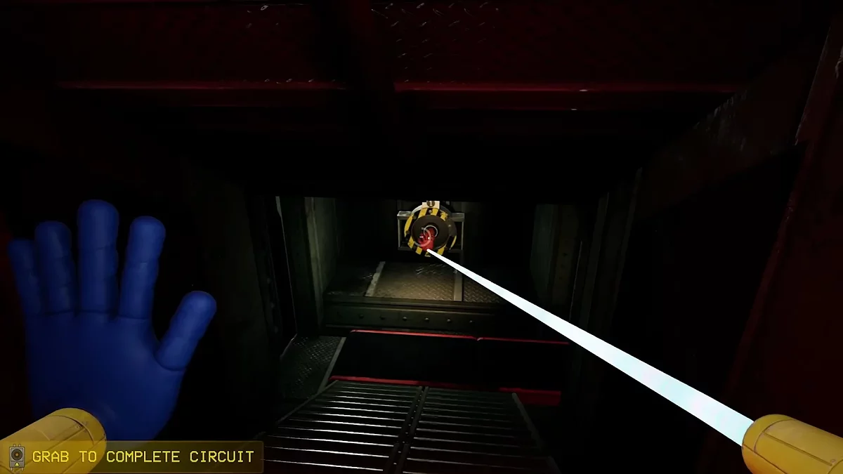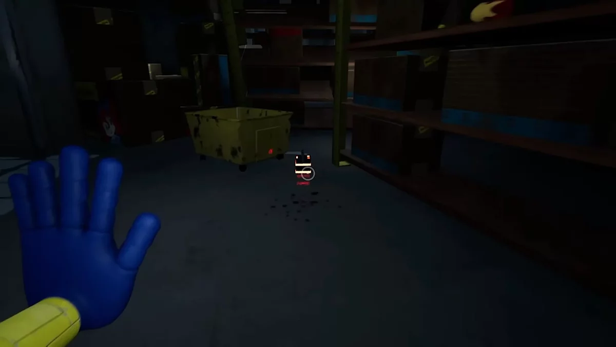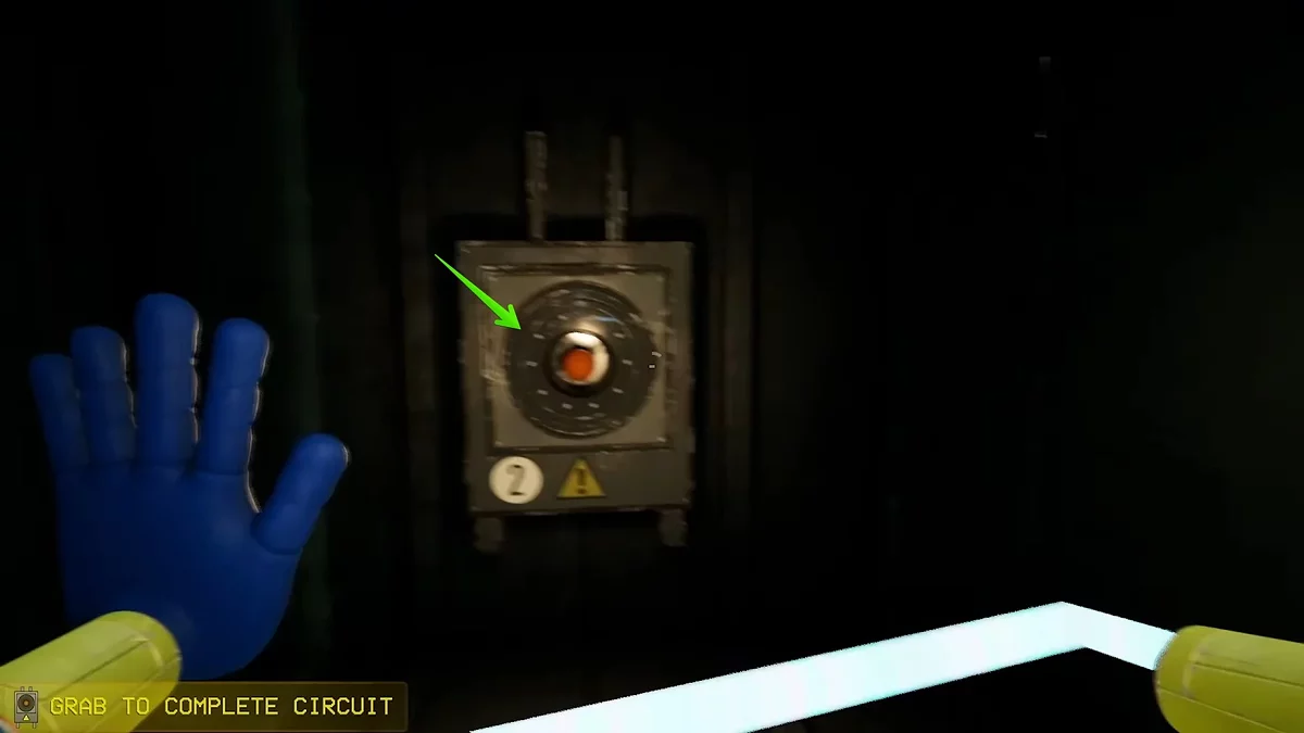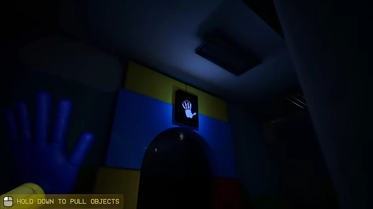 Помните изображение синей руки в предыдущем зале? Нужно вернуться и взаимодействовать с ним, чтобы открыть очередной проход. Сделав это, доберитесь до двери с надписью «05». Вы попадёте в комнату с мусорными контейнерами и желтым видеопроигрывателем. Заберитесь наверх и осмотрите пульт управления. Сюда нужно отыскать четыре элемента определённых цветов, первый как раз ждёт слева от него.