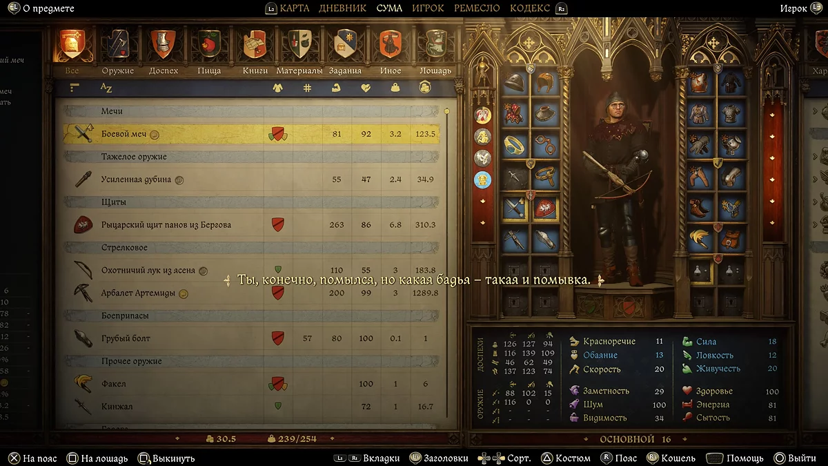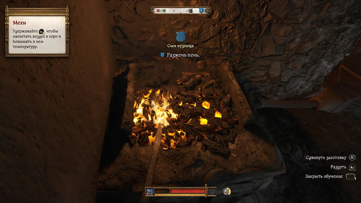 Меч — ваше главное, хотя и не единственное оружие. Однако время от времени его необходимо затачивать. В каждой кузнице и почти в каждой деревне есть точильное колесо. Водите по нему мечом так, чтобы летели искры. Когда качество меча станет 100%, Генри сам скажет, что заточка удалась. Остерегайтесь дыма. Это означает, что угол неправильный, и вы рискуете испортить вещь.