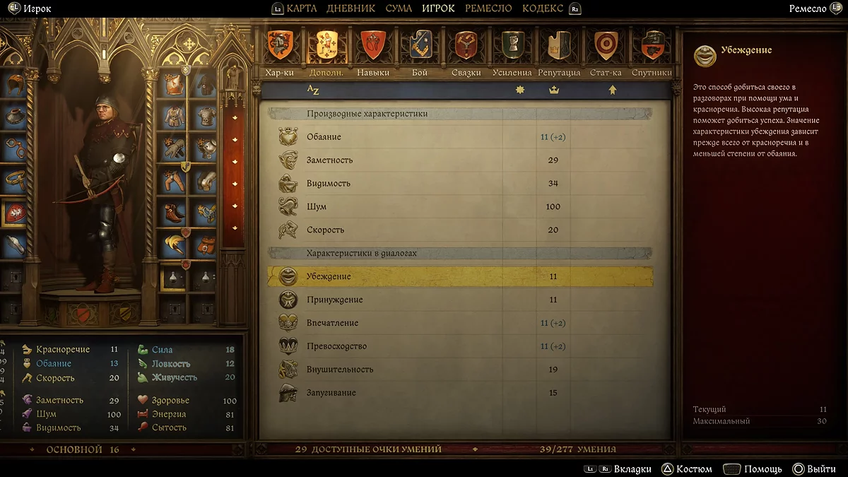 - Впечатление — ещё один компромиссный вариант, на который влияет качество и красота как самого Генри, так и одежды. Тут играет роль ценность вашей одежды, насколько вы чистый и хорошо пахнущий. Чем выше характеристика «Обаяние» в меню инвентаря, тем больше шансов на успешный исход.