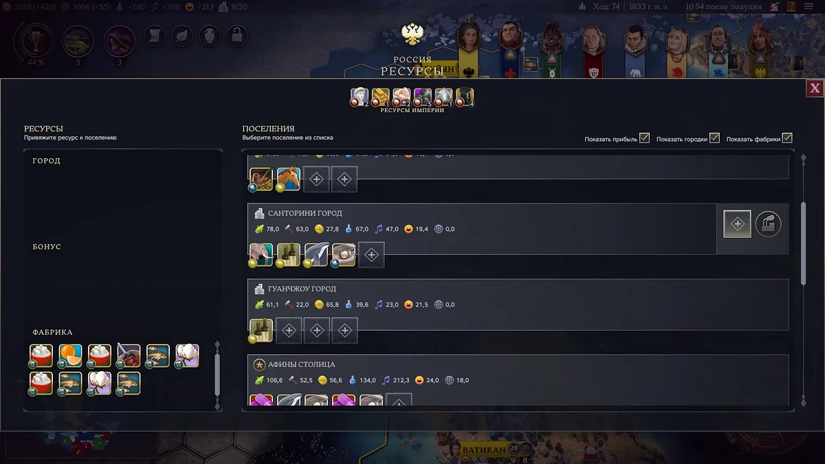 С появлением фабрик в городах, вы сможете размещать в них фабричные ресурсы. Однако учтите, что в каждом поселении можно разместить лишь один ресурс. Для этого в окне ресурсов появятся специальные ячейки.
