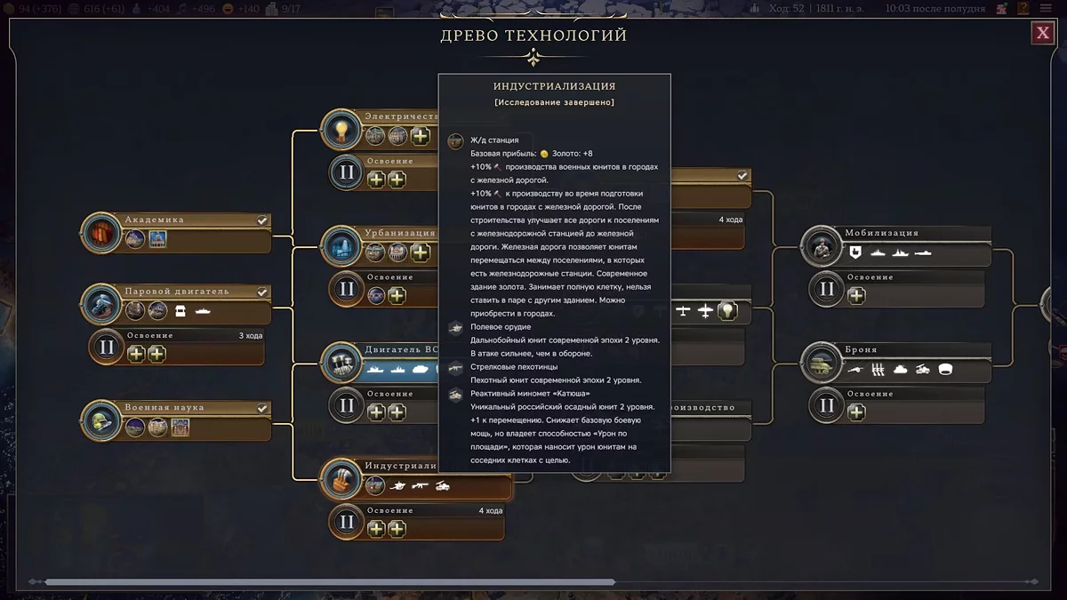 Если города связаны со столицей железной дорогой, а фабрики до сих пор недоступны, значит, надо завершить еще одно исследование, на этот раз «Массовое производство». Именно оно открывает строительство фабрик.