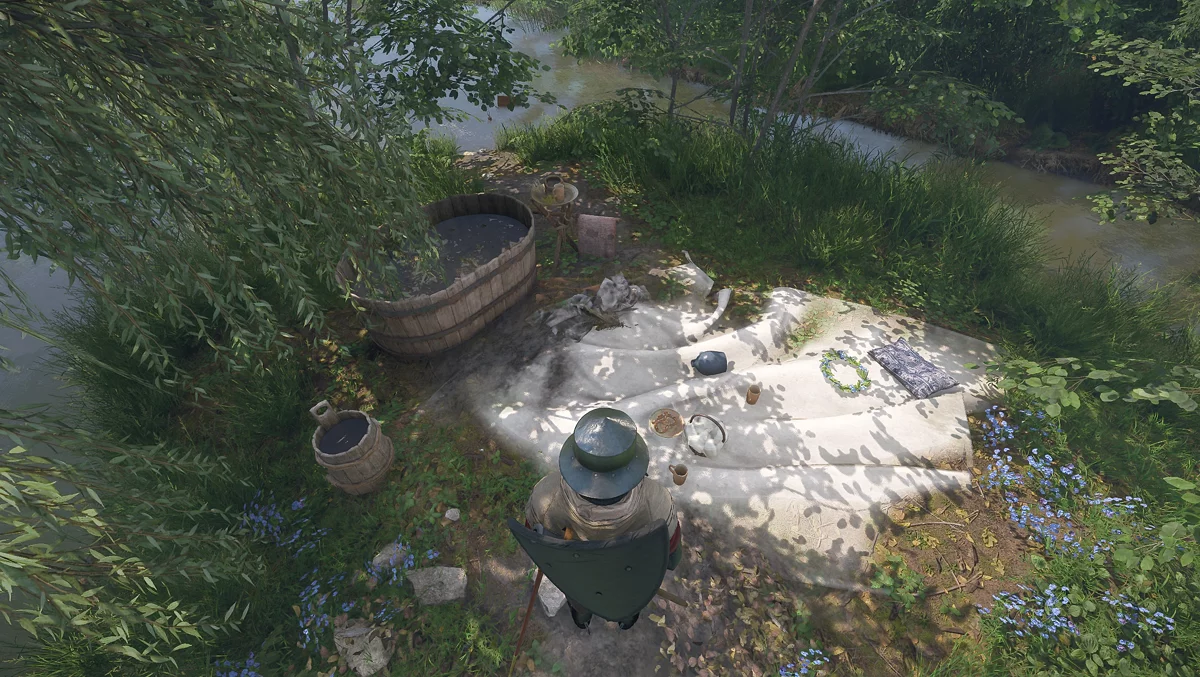 Подойдите к реке и двигайтесь вдоль левого берега, пока не найдете поляну с голубыми цветами и дерево, рядом с которым лежат три матраца.