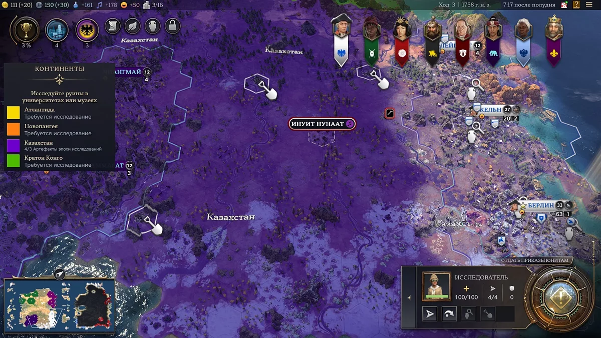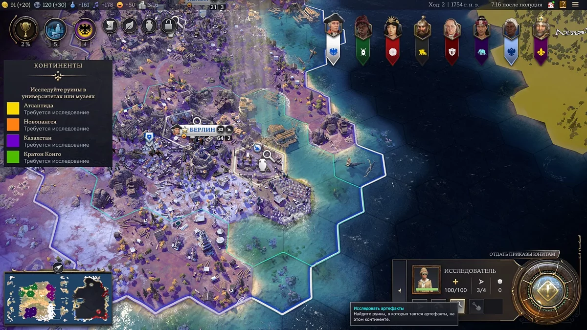 Без открытия определенного региона мы не сможем собирать артефакты. Исследовать условный Казахстан или Атлантиду можно в ближайшем музее или университете: нужные места отмечены лупой и античным сосудом. Стоит учитывать, что исследователи могут свободно перемещаться по территории другого правителя и пользоваться его зданиями.